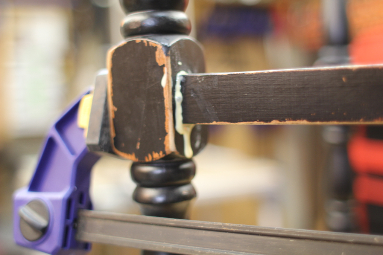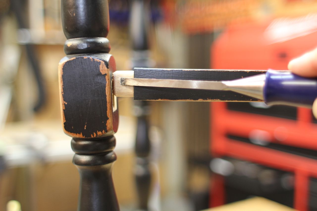I used a bar clamp to spread the stretchers further apart exposing the tenon and mortise.
