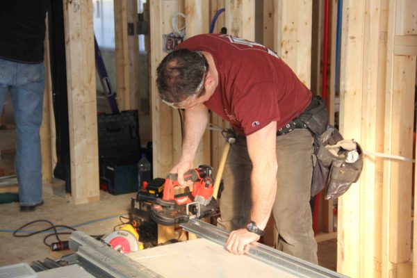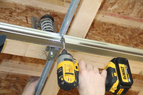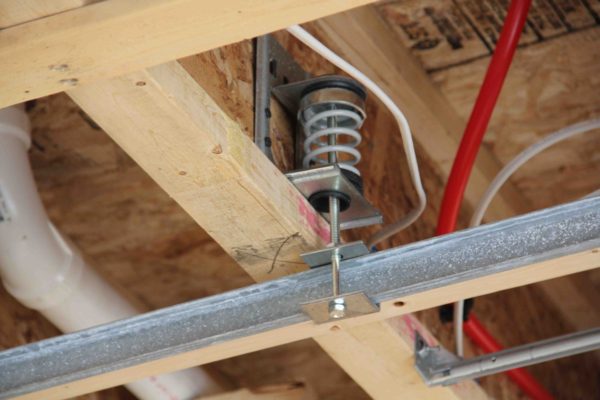 The end result is a ceiling that is isolated from the house framing and therefore providing vibration isolation. when installed with the floor joists you can maximize your ceiling height. On this installation, several factors necessitated us to install the brackets and run our carrying channel perpendicular to the joists. Either way works with this system.
