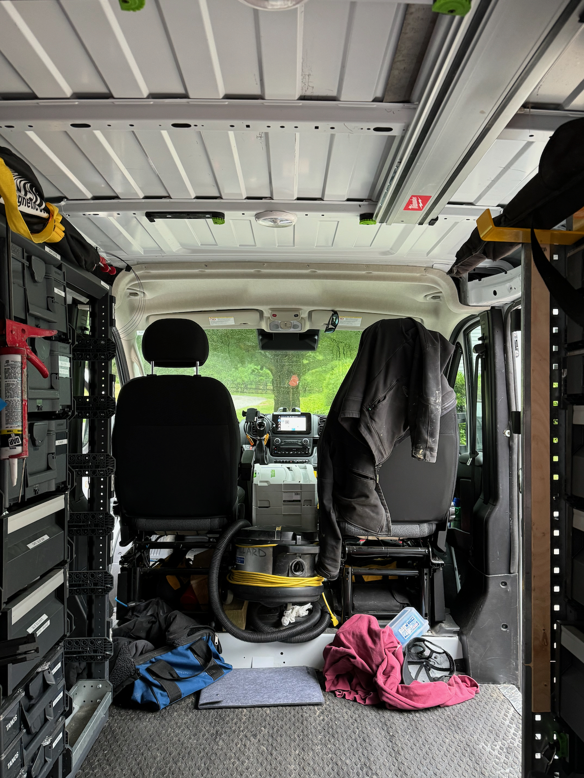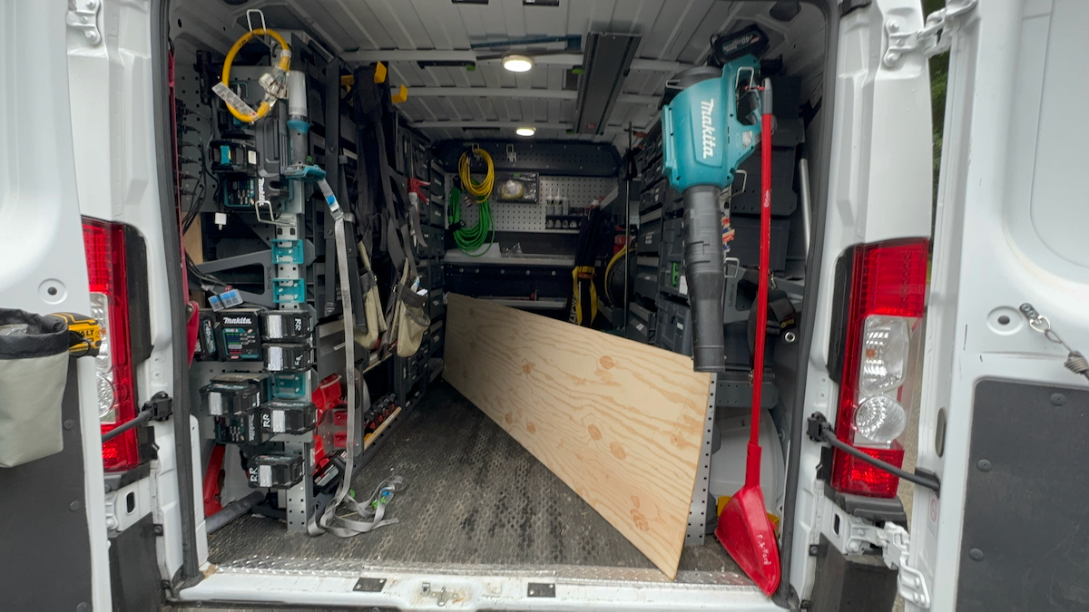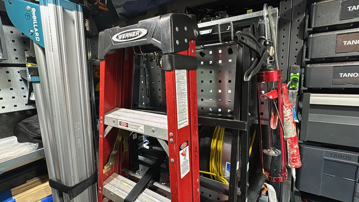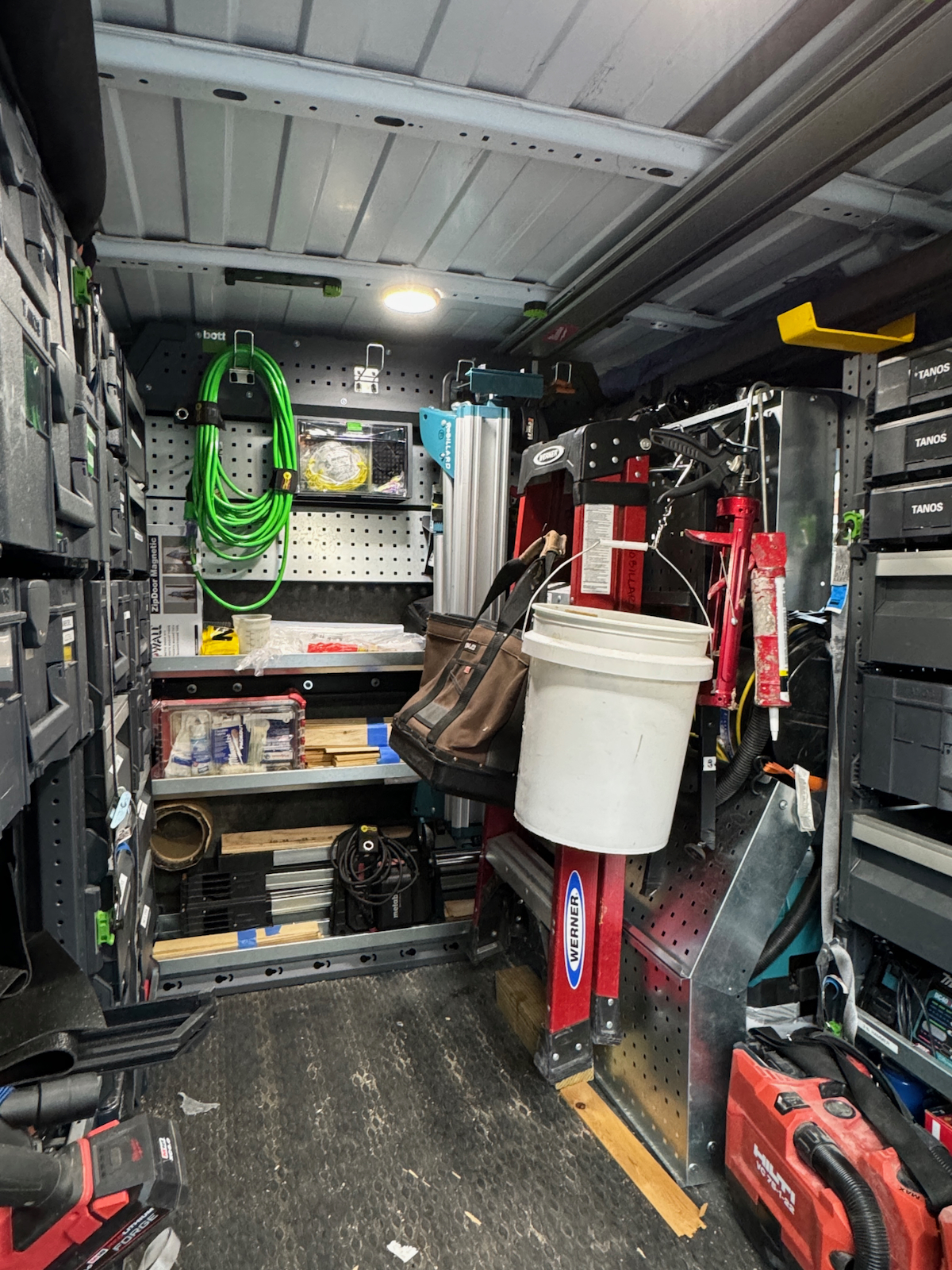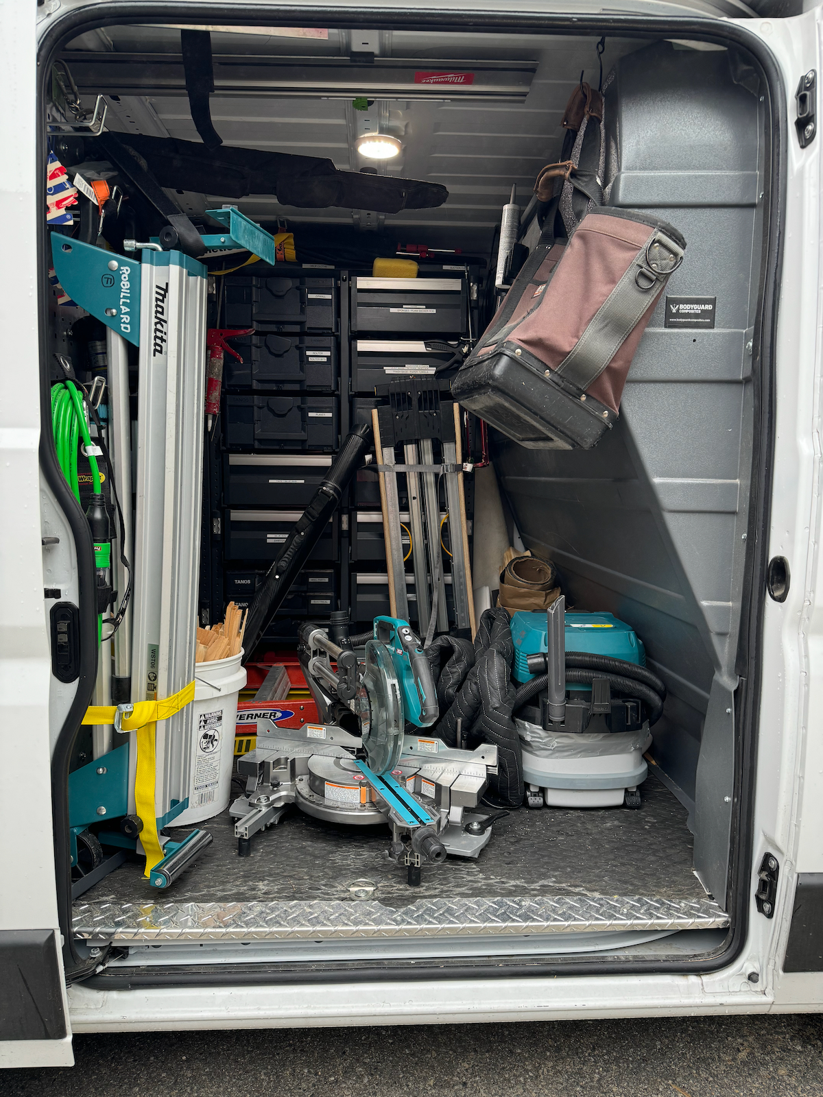 Furthermore, larger tools such as vacuums, miter saws, and table saws had to be stored on the floor, hindering movement within the van and complicating material transport. Moreover, essentials like a 4-foot ladder, table saw stand, and saw horses were secured in front of drawers and toolboxes, necessitating their removal for access—a cumbersome process.