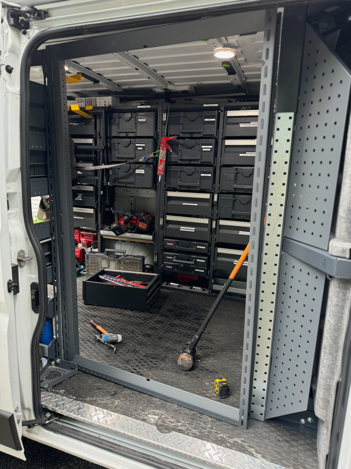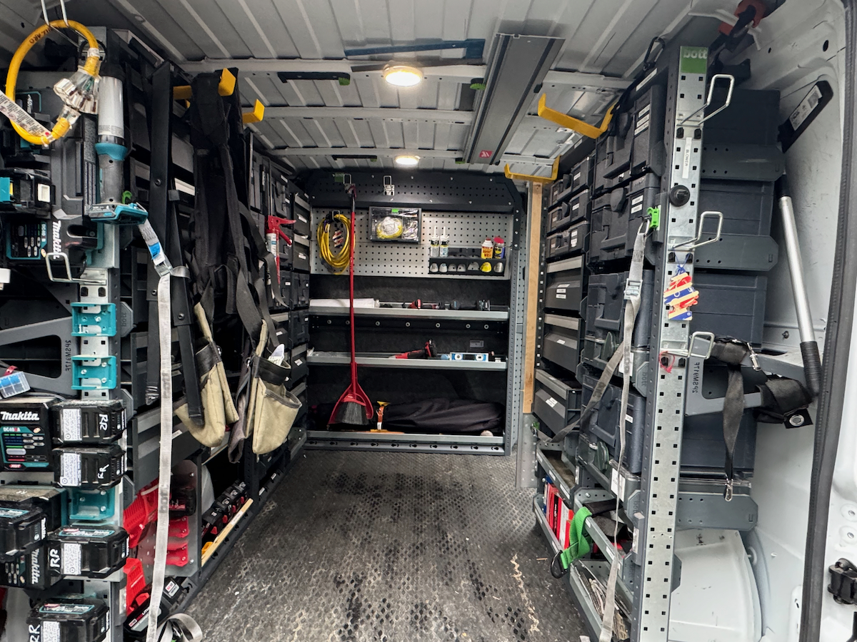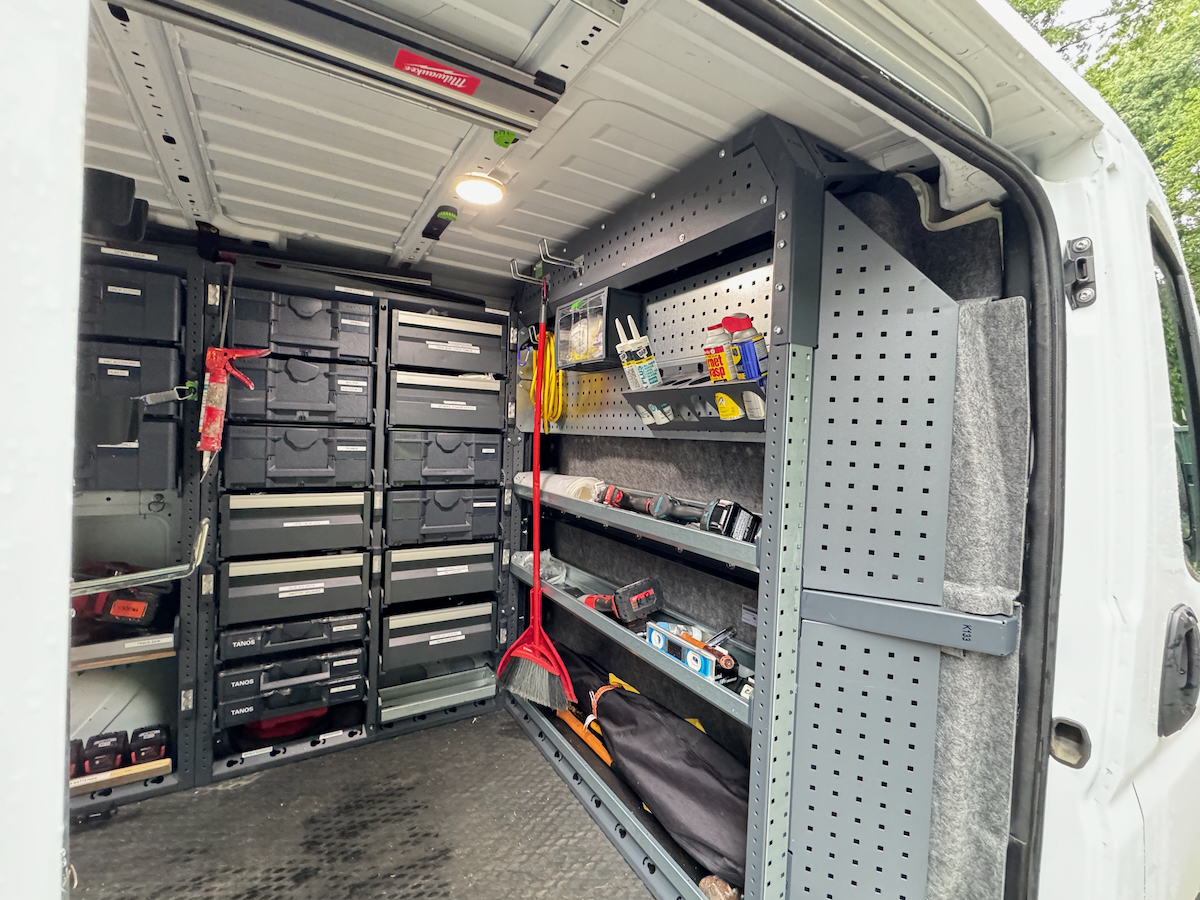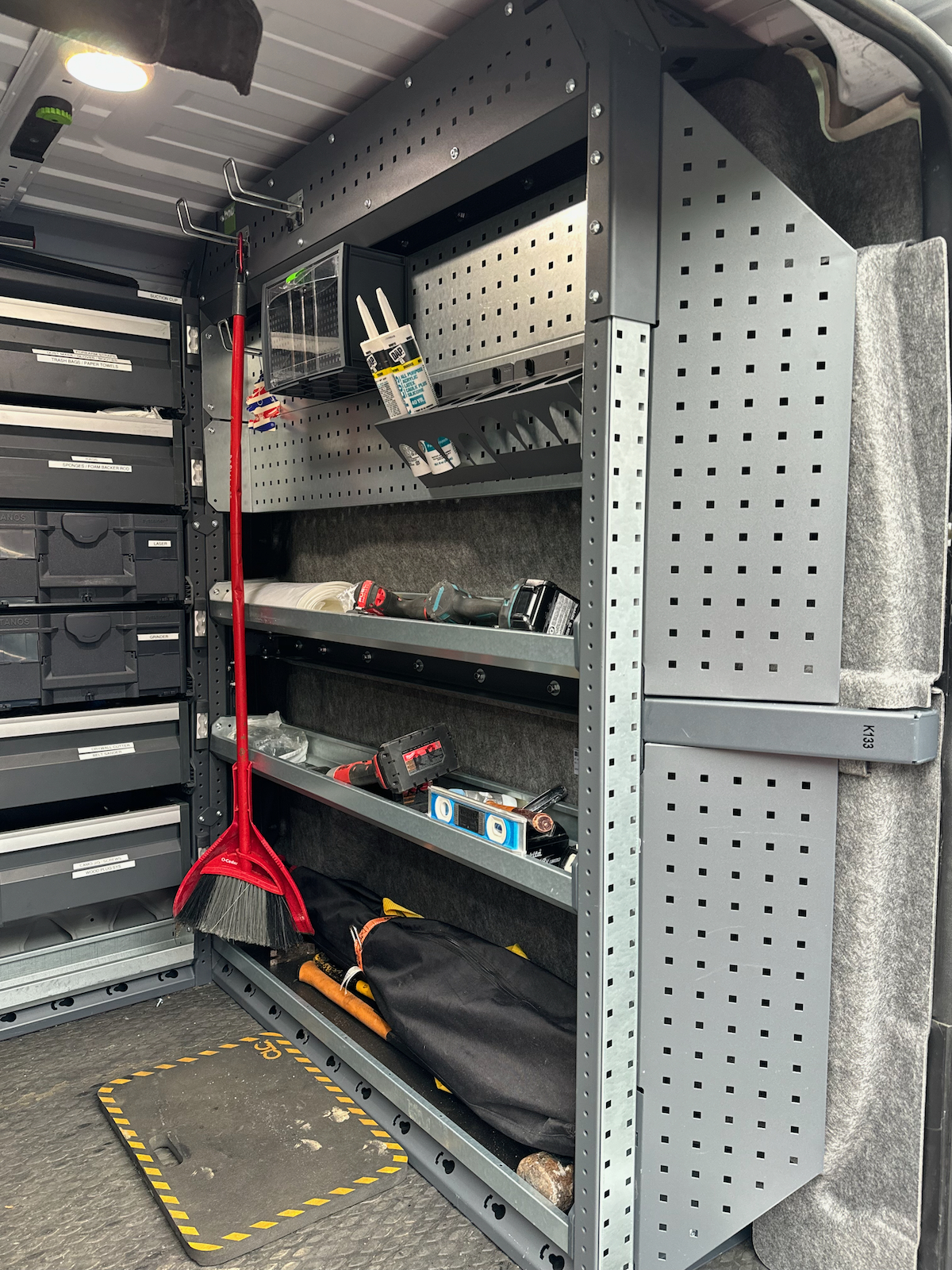 The new shelving system along the side door partition has significantly optimized cargo space, allowing secure mounting of the table saw stand and ladder using Bott Smartvan hooks. This arrangement has streamlined access to drawers and toolboxes, enhancing efficiency.
