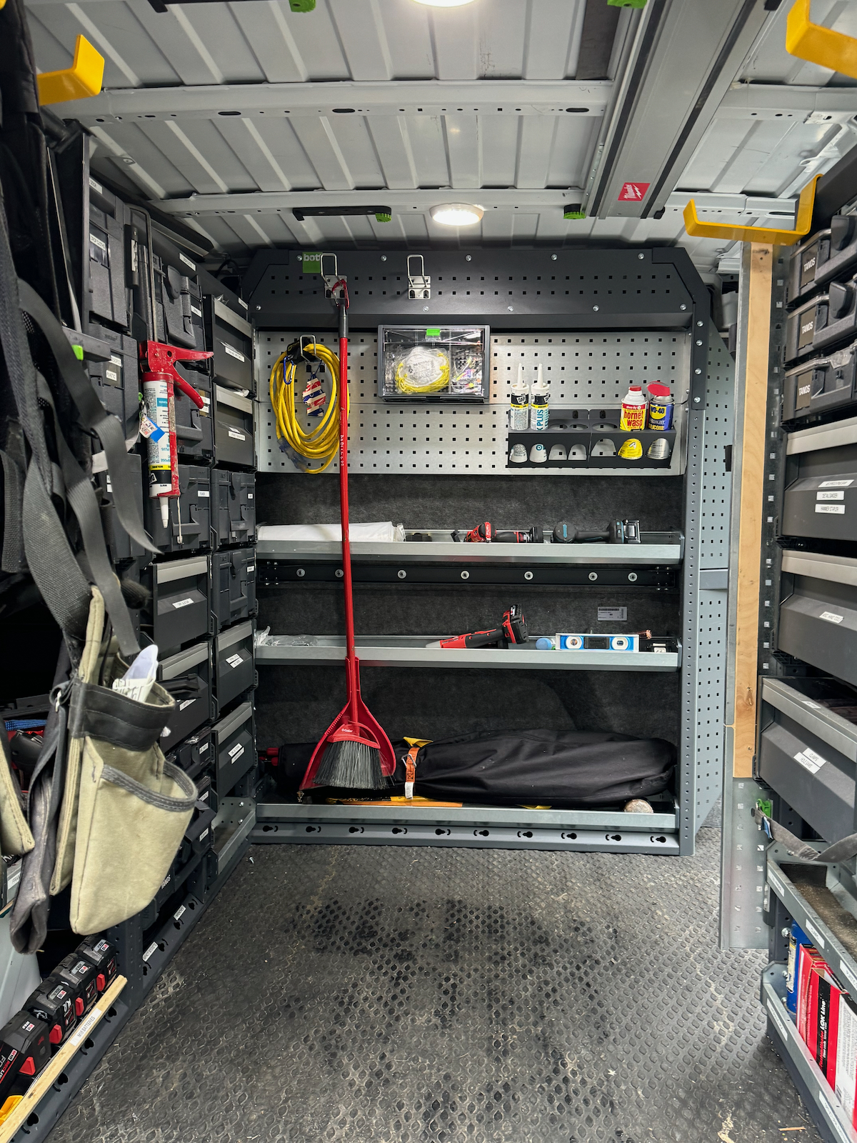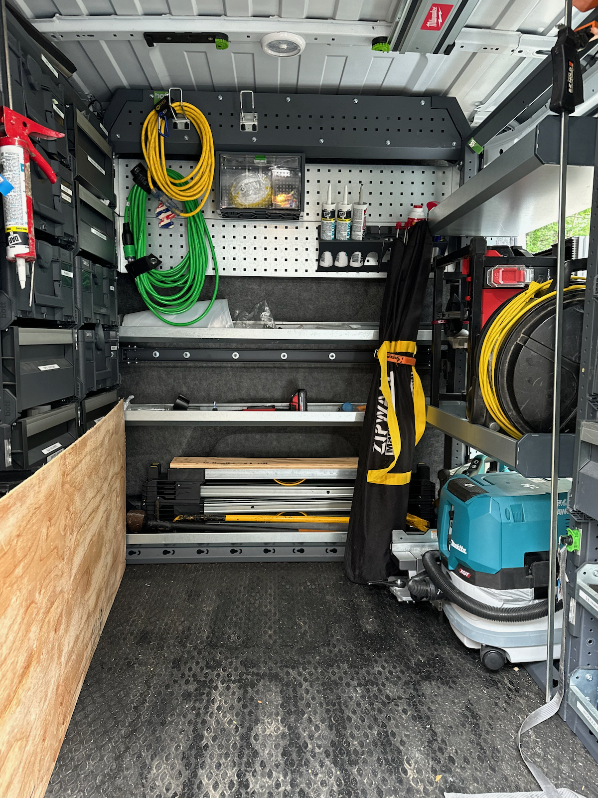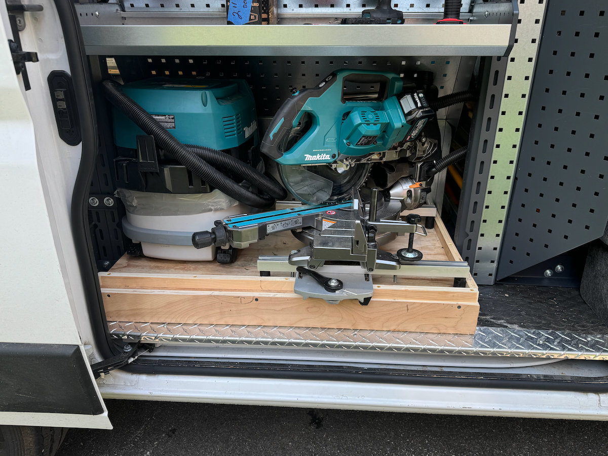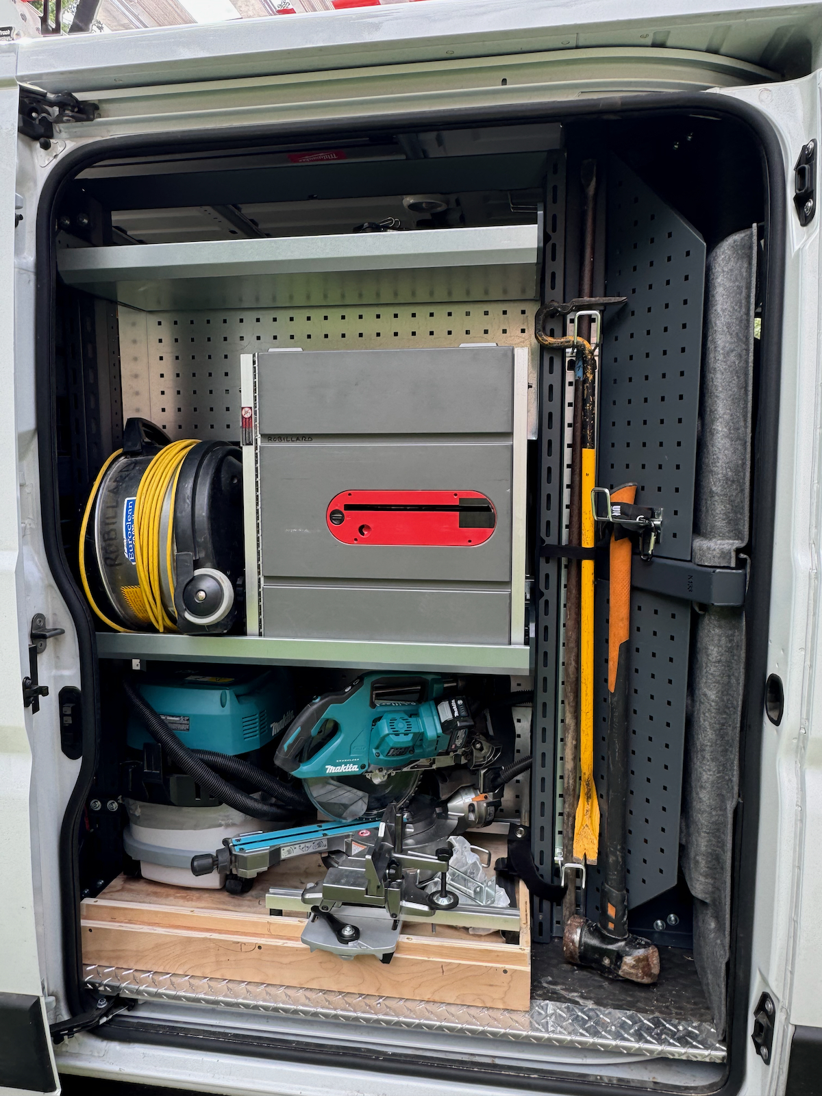 Initially apprehensive about losing side door access, I’ve found the enhanced system remarkably efficient. Accessing and removing tools like the miter saw, table saw, and vacuums from outside the van has proven quicker, easier, and less taxing on my back. The organized and secure storage ensures equipment safety and expedites workflow.
