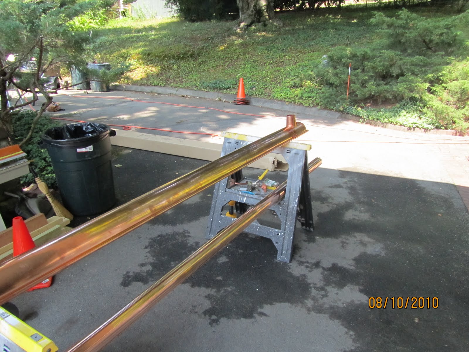 Front view of copper gutter system. Still waiting to install the downspout pipe. [left]