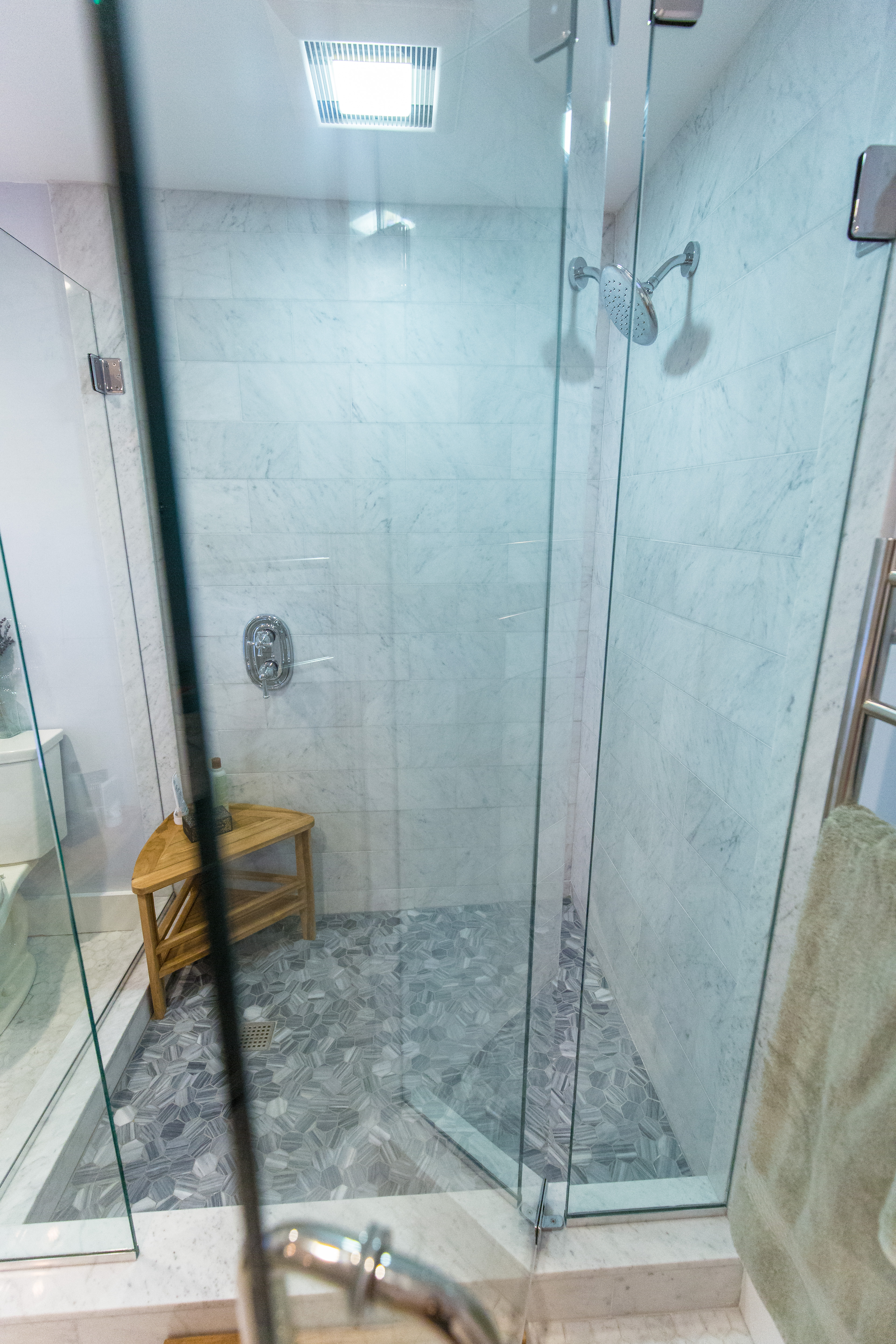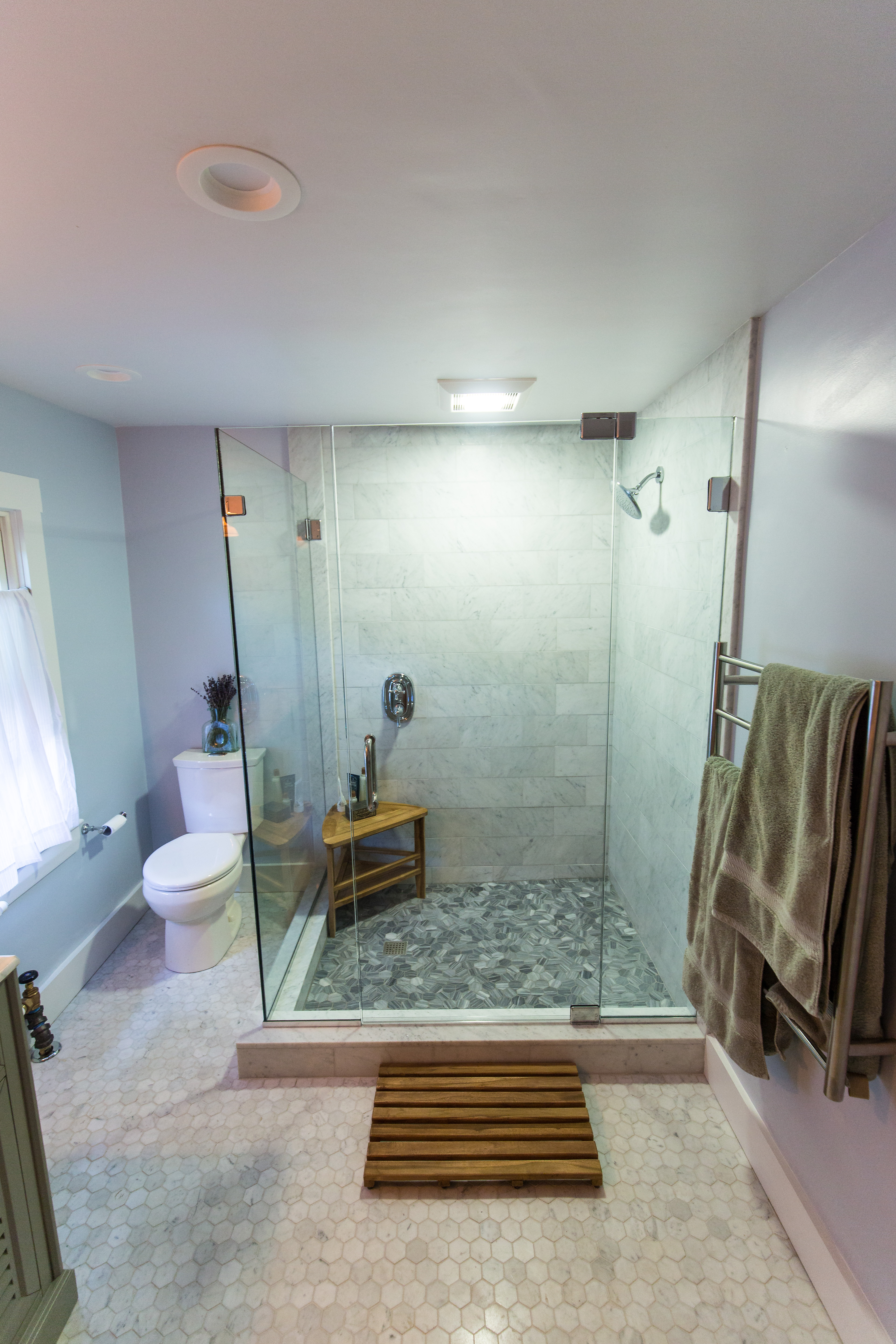 I also knew that an all-glass shower would help our bathroom feel bright and airy. Old houses contain a lot of mysteries, and one of the mysteries of our 1860 New England home was that the upstairs bathroom had been divided into two small rooms, making the space feel very cramped and dark. Resolving this involved a ton of work, time, and expense — pushing one wall back, and tearing out another wall, moving a washer-dryer unit to the basement, and so on. Rebuilding an enclosed shower would have just undone all the work we’d done to open up the space.