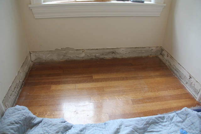 Lastly I reinstalled the baseboard, used wood filler at all exposed nail holes, sanded flush, vacuumed up and notified the painter.