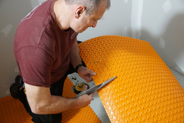 The Schluter DITRA-HEAT-DUO  comes in both a roll or by the sheet and has a stud designed to allow for the easy installation of DITRA-HEAT-E-HK heating cables. We chose the sheets since it was a small room, and it was also easier to cut them at the toilet and floor drains.
