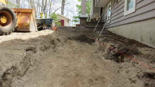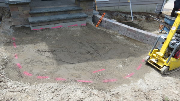 The job was a new landscape construction project, after a large remodeling and addition. Once the front entrance was completed we moved onto the design of the walkway. From the front steps the design called for a medium size landing, three steps because of the grade, and built-in walkway lights.