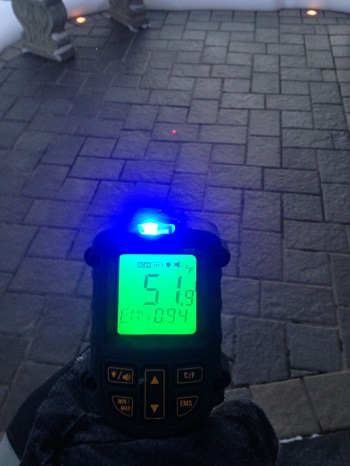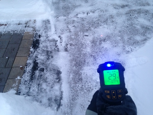 The outdoor temperature that day was 20 degrees Fahrenheit with an even colder wind chill. The temperature of the walkway was 46-51 degrees Fahrenheit using an infrared thermometer. The reading was taken after the walkway was warmed and had dried of any moisture. To give you a comparison, the snow shoveled non-heated driveway was only 29 degrees Fahrenheit using the same thermometer.