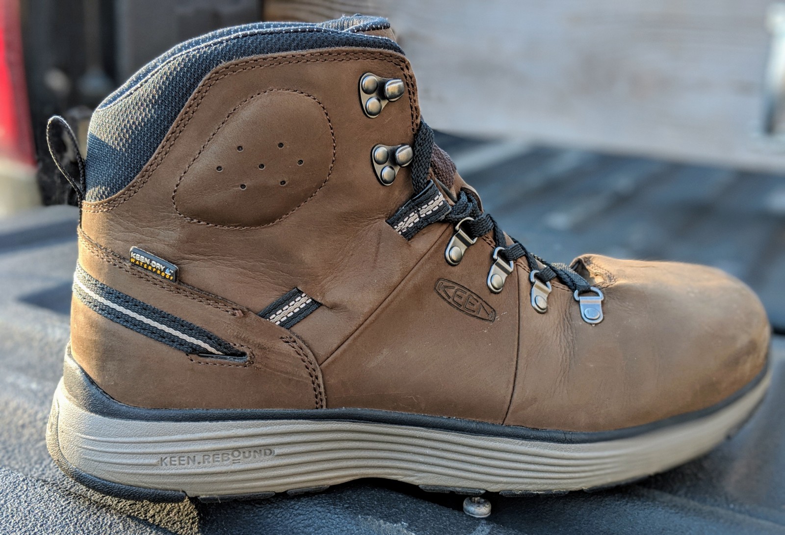KEEN packed a lot of technology into these boots. My pair came in the Cascade Brown/Brindle color pattern, and the leather upper resembles classic mountain hiking boots. The waterproofing makes water roll off of the exterior of the boot. The matte finish of the leather handles abrasion well and gains character with wear.