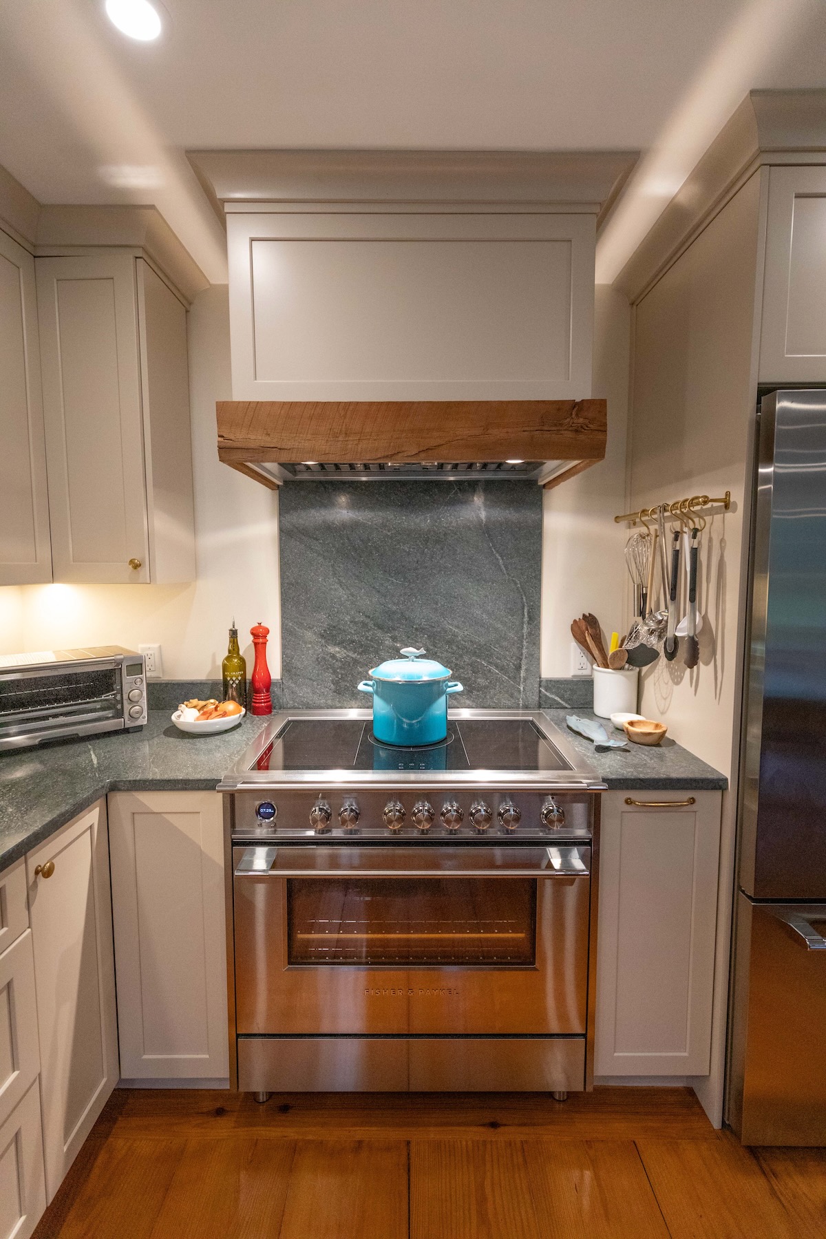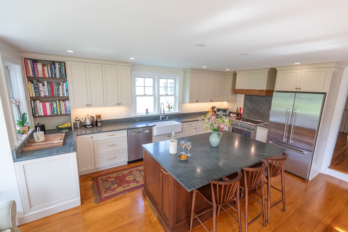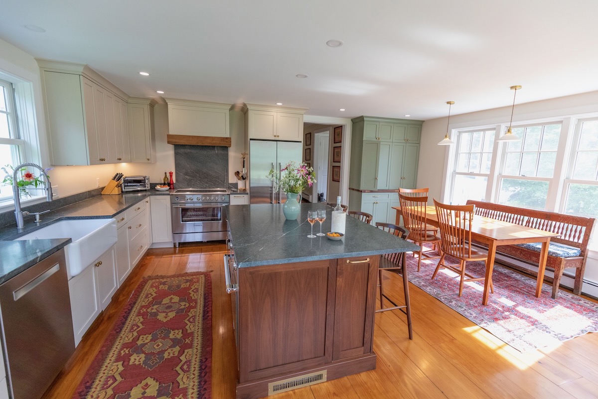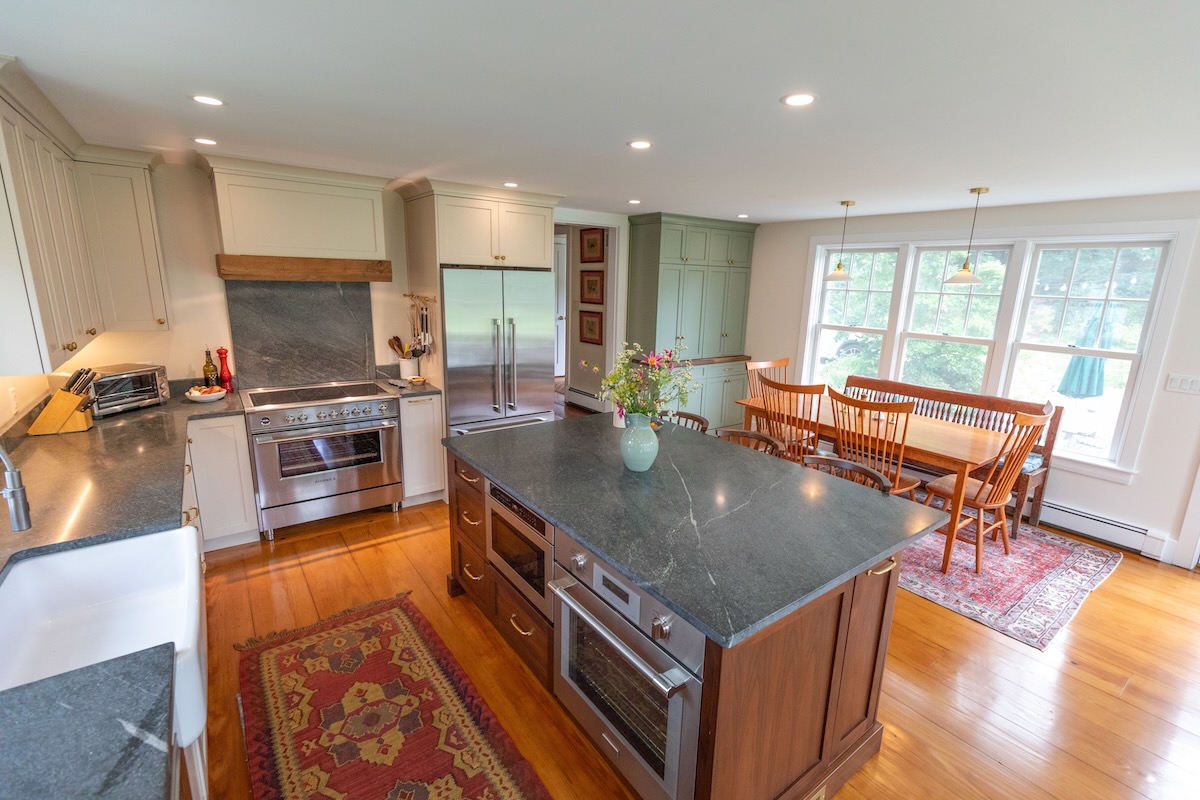 We approached this kitchen with the goal of using semi-custom cabinets, high-end appliances, and locally inspired materials, including soapstone, reclaimed wood and wide plank wood flooring to compliment this sensitively restored 1684 home.
