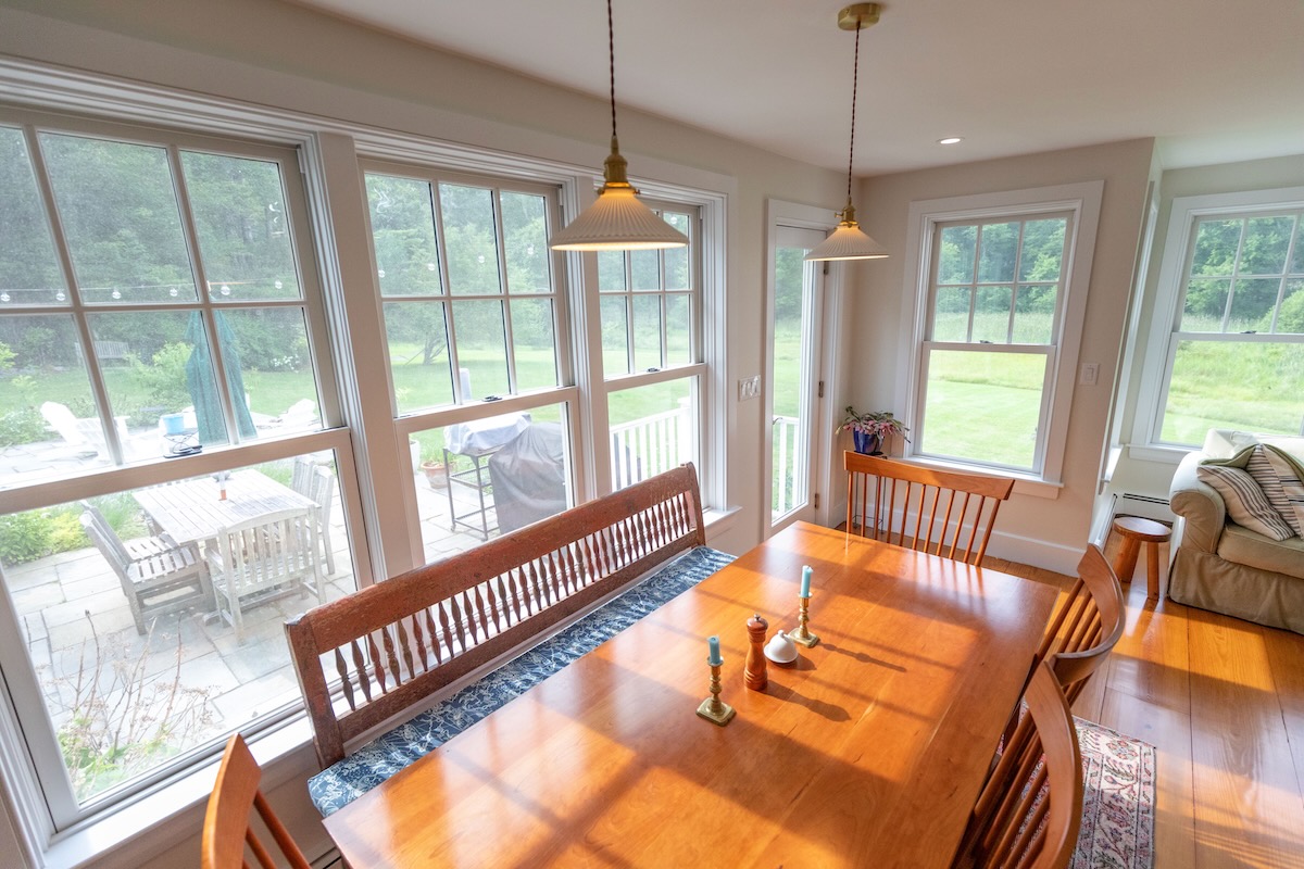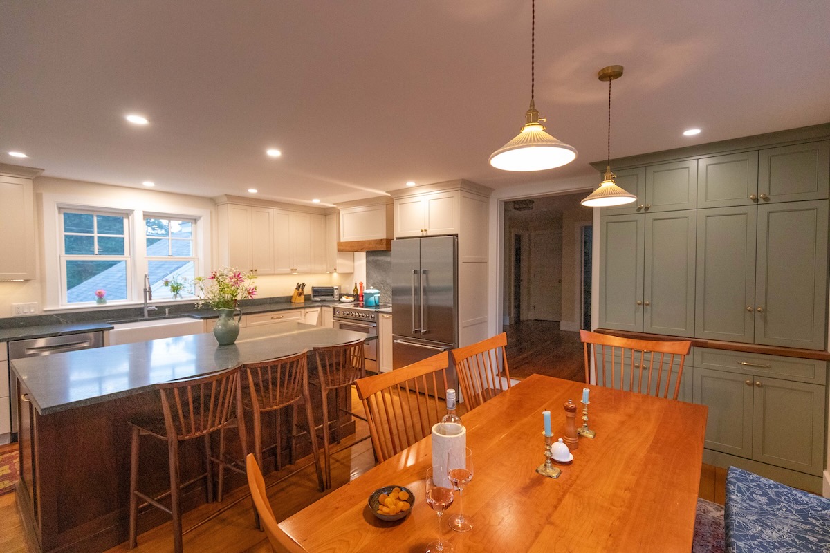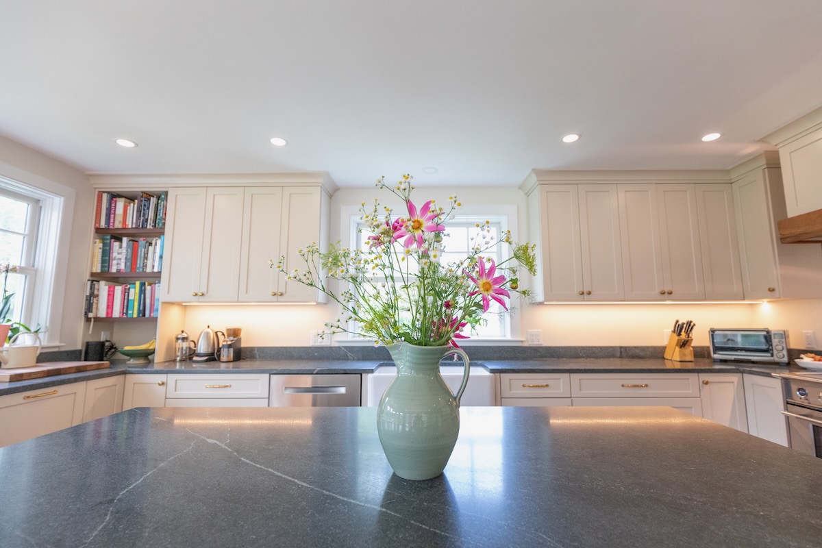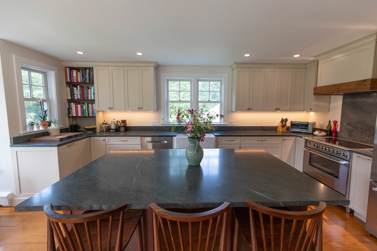 We approached this kitchen with the goal of using semi-custom cabinets, high-end appliances, and locally inspired materials, including soapstone, reclaimed wood and wide plank wood flooring to compliment this sensitively restored 1684 home.