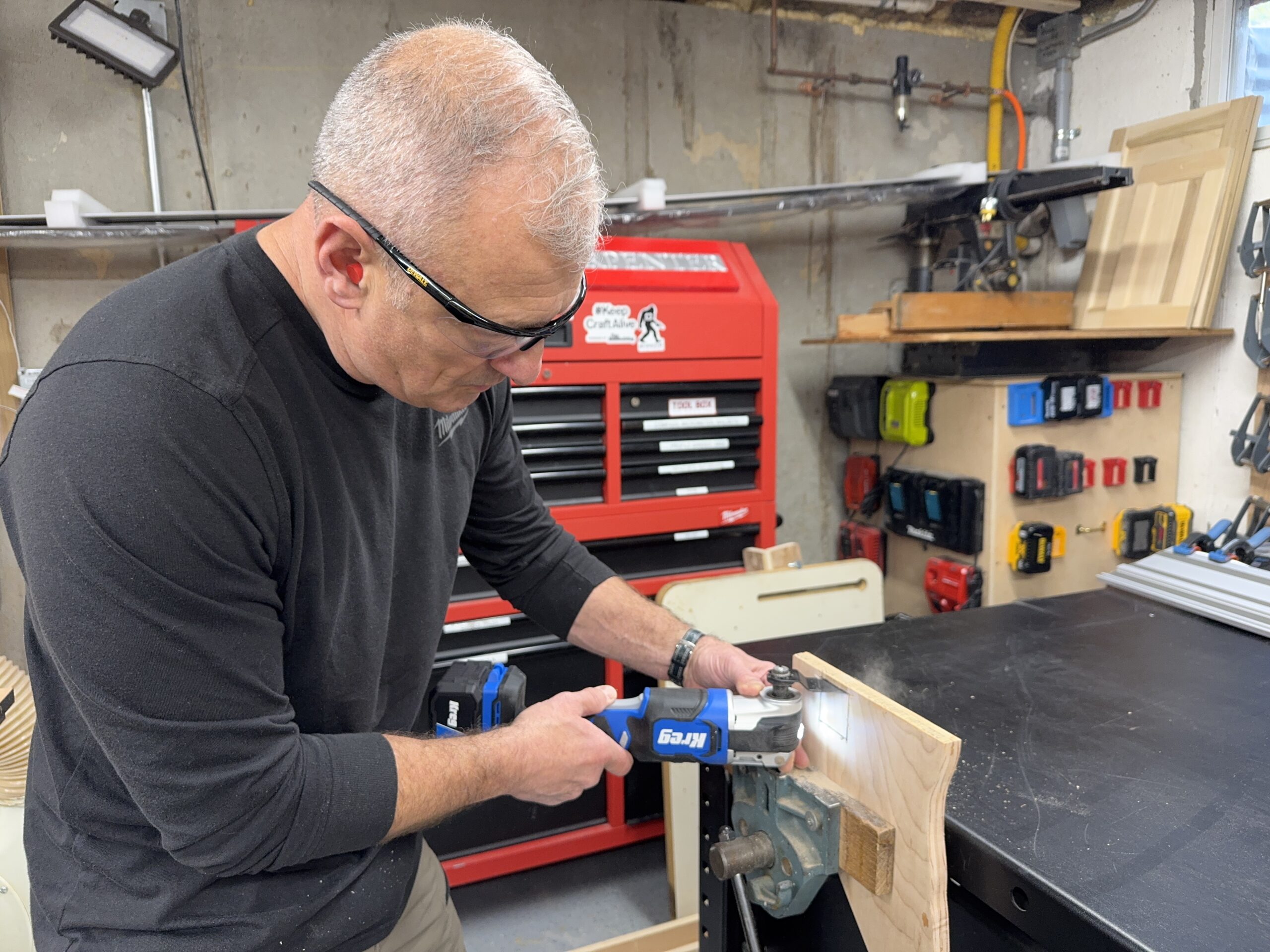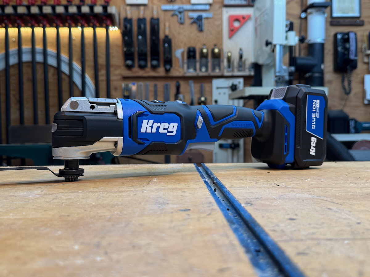 The Kreg 20V Ionic Drive Oscillating Multi-Tool offers variable speeds from 7,000 to 17,000 OPM and accepts both open- and closed-back universal blades. It features a tool-free blade change system, and the blade-release lever works especially well. The large push-button trigger includes a lock-on function, and the LED light is bright and genuinely useful.
