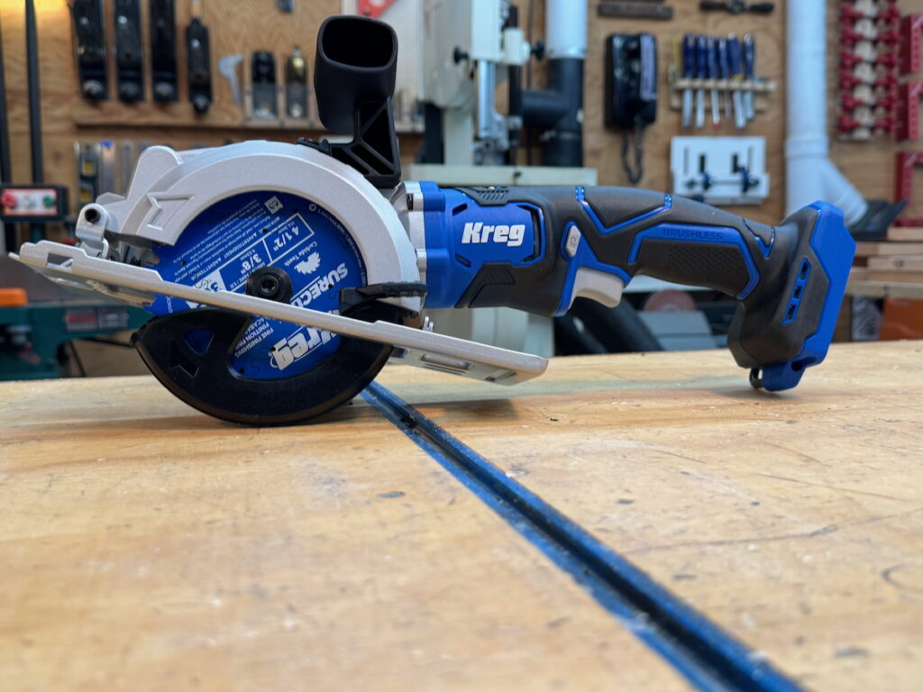 This compact cordless 4½” circular saw uses a brushless motor running at 5,000 RPM and a 36-tooth blade on a 3/8″ arbor. It’s powered by Kreg 20V Blue Ion batteries. Cutting depth is 1 11/16″ at 90° and 1 1/16″ at 45°, with bevel adjustment from 0°–45°. The saw includes an auxiliary handle, soft-start, electronic blade brake, LED lights, a 1¼” vacuum port, onboard tool storage, and clear depth indicators.
