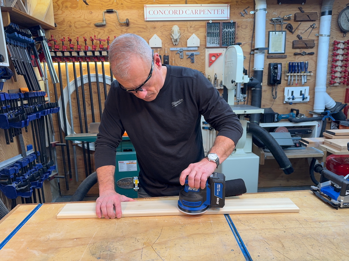 In use, the sander felt comfortable, had good power, and removed material quickly, though it does produce a noticeable amount of vibration. Price: $200 kitted with the smaller battery.