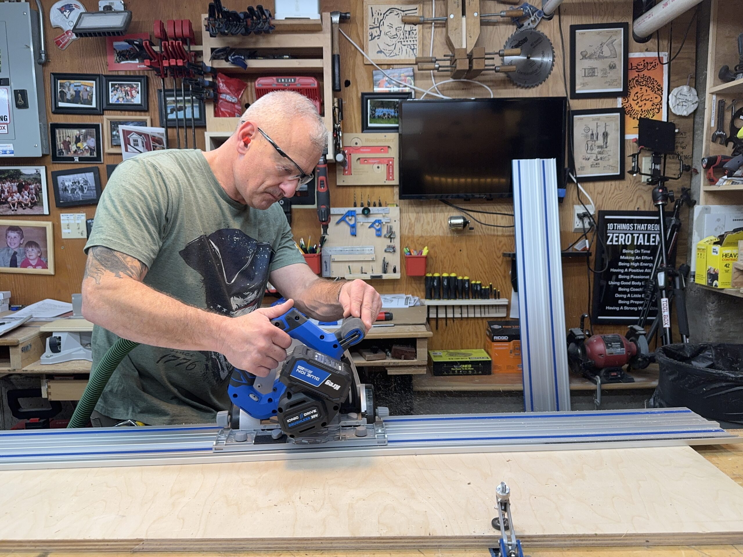 Overall, I liked the saw. It registered to the track quickly, had plenty of power for plywood, and the plunge action was smooth. Dust collection was disappointing with a vacuum attached, even after taping over the blade-arbor opening. Still, I managed about 150 linear feet of birch plywood on a single 4Ah battery.