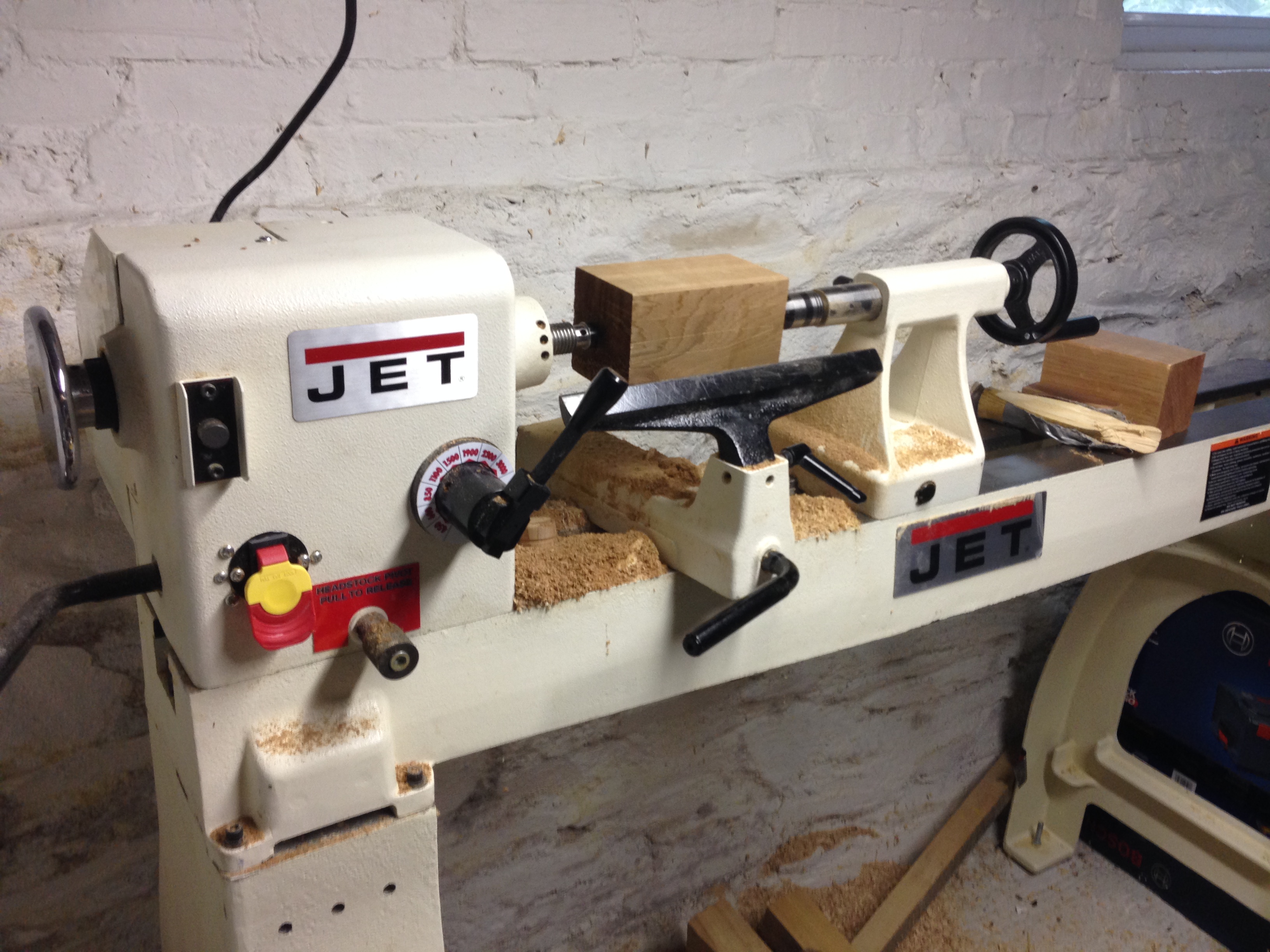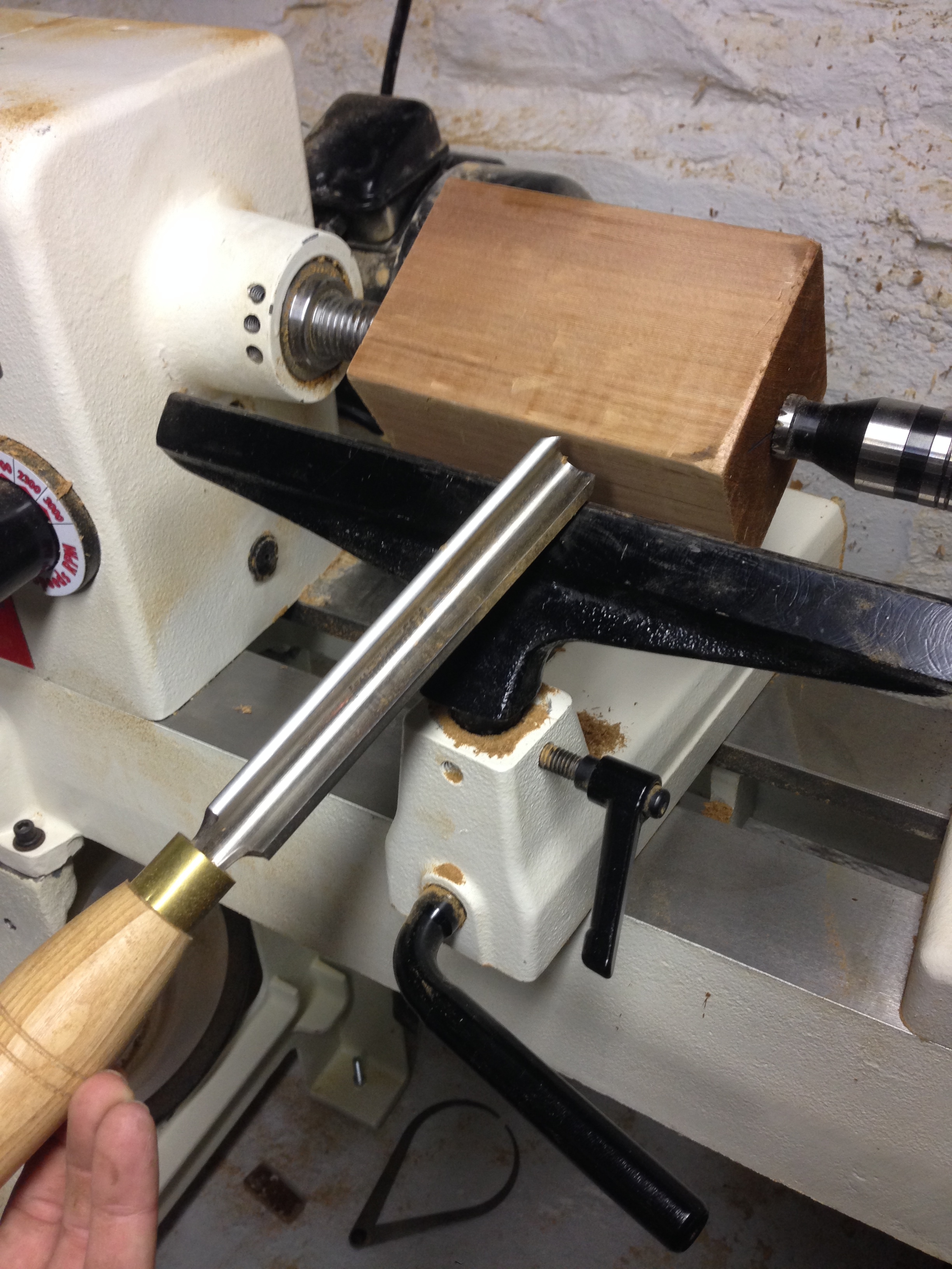 Removing the piece from between head stock and tail stock, I screw my bowl chuck on the head stock and tighten it. The base gets tighten with a hex wrench and my tool rest is positioned in the same position as before.