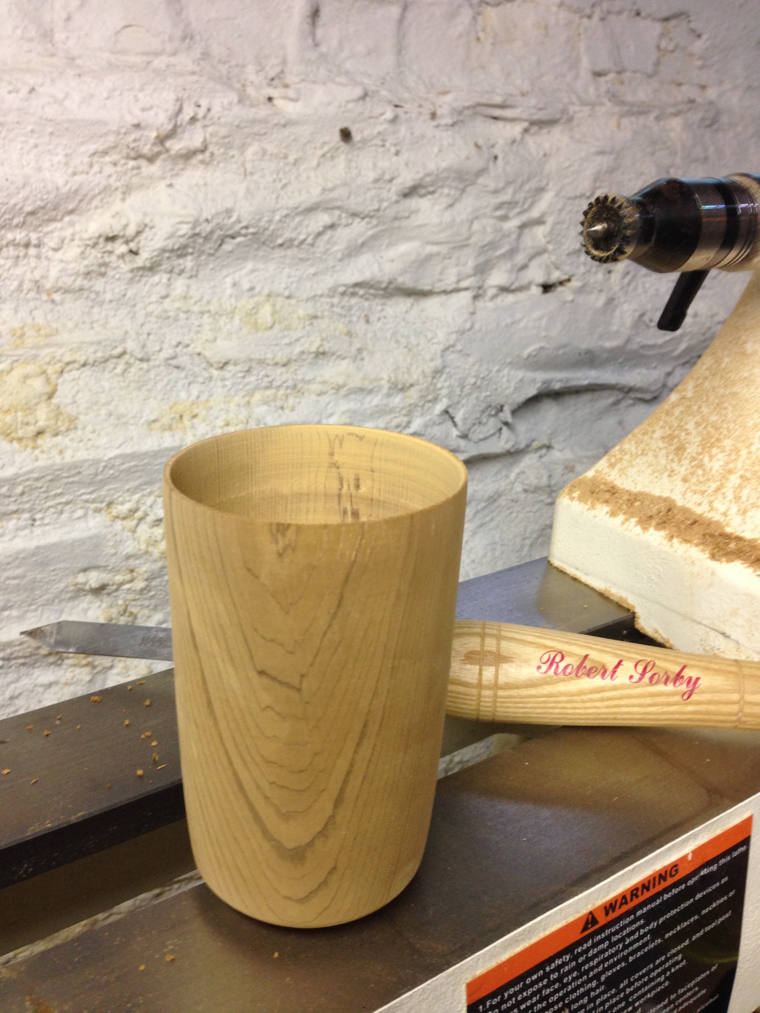 While using a roughing gouge on the tool rest, I position myself for making sweeping paths from right to left . Once the block is fully round, I now detail my design points for the shape that I want to make. With this project a simple small chamfer is at the base, with a gradual cone shape to the top, but with more complex turnings such as a baluster, a drawing is used for reference. Calipers are used here for the first design phase of the turning and will come in handy at the finishing of the piece.