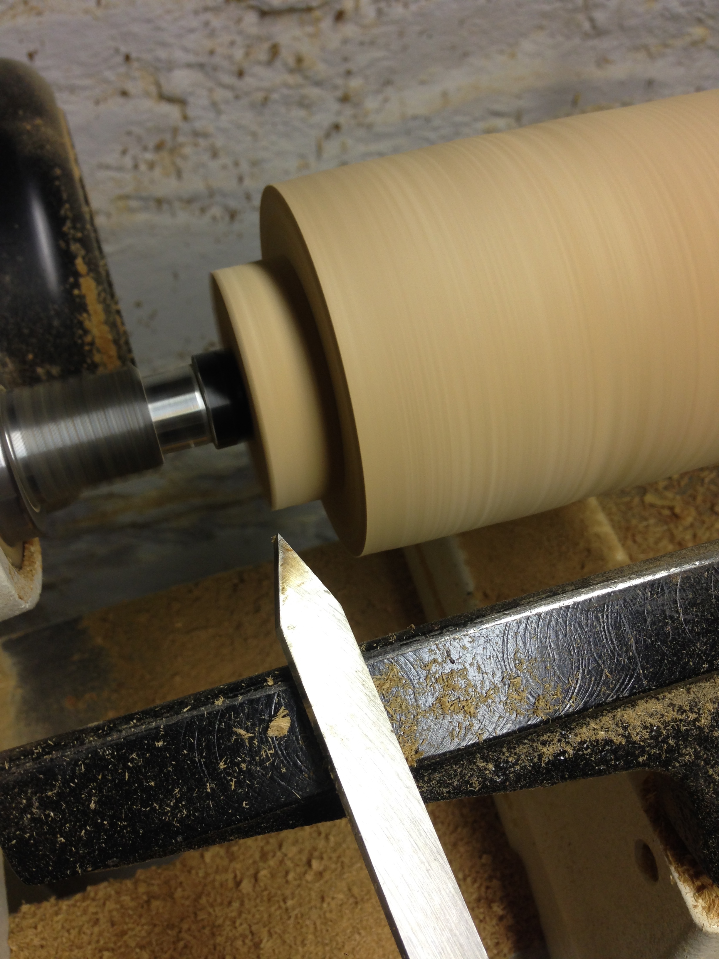 Using the roughing gouge to begin turning.