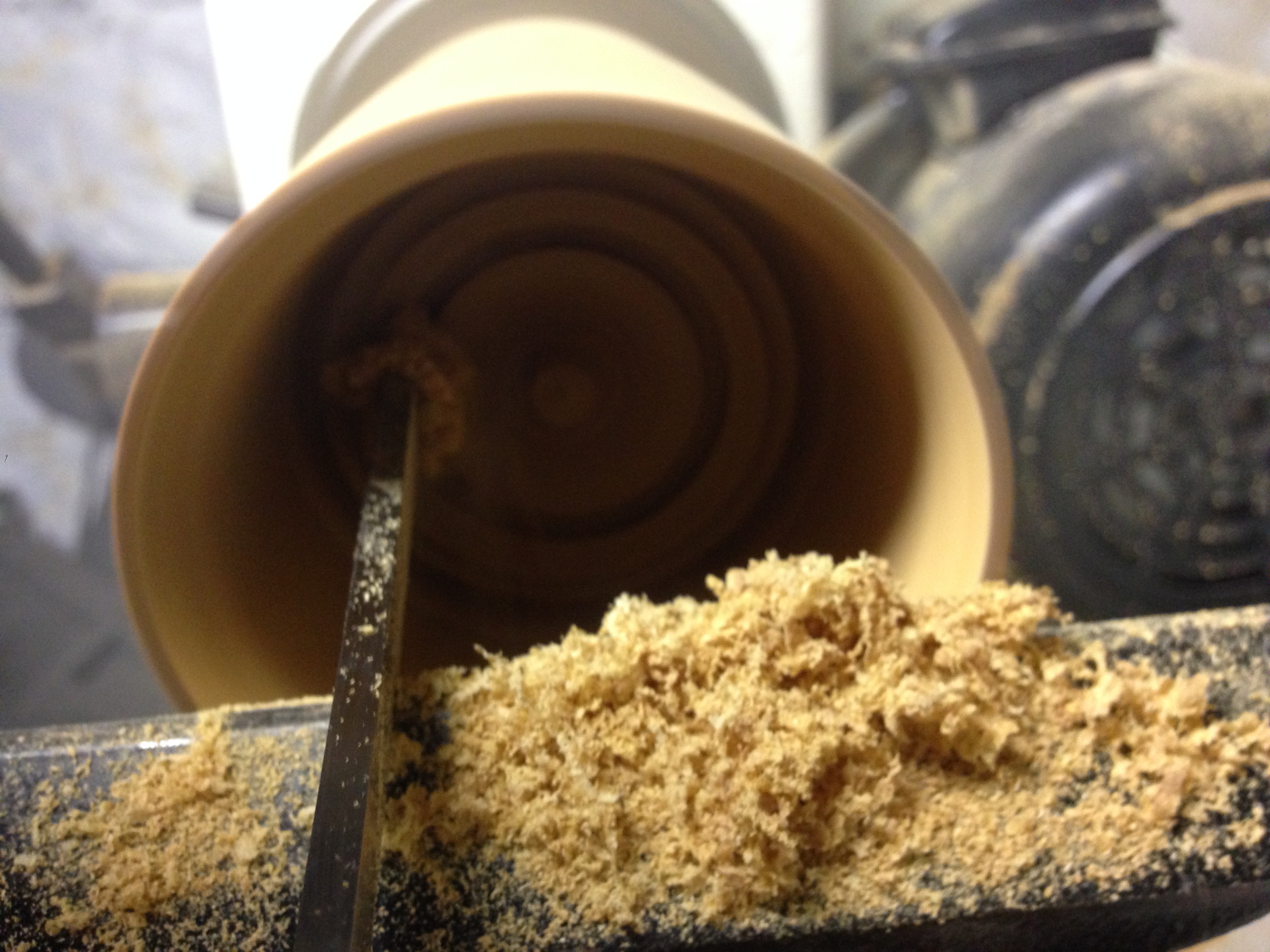 When tightening the piece to the bowl chuck, the piece sometimes becomes off kilter and a quick swipe on the outside to realign in true form. Once the piece is turning true, I turn the tool rest to the top and use my bowl gouge to begin the inside. Holding the gouge in the center and sweeping to the outside, it takes many passes to carve out the inside. I use my parting tool, a very narrow piece of steel to make reference marks on how deep I can carve out the inside. I switch back from the bowl gouge to the parting tool to complete the inside leaving about ¾ “ to ⅞” on the bottom and about ⅛” in thickness throughout the body. Calipers are the best tool to determine sizes for turning and reference to go back to the exact dimension needed.