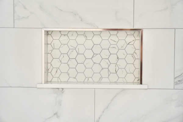 To give the master bathroom remodel a modern feel, we chose large-format wall tiles supplemented with small, octagon tiles on the floor and wall niche. Schlueter finish strips outline the niche and help us create a clean termination at the end of the shower tile wall.