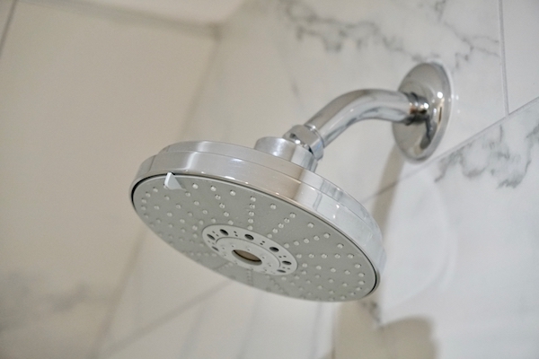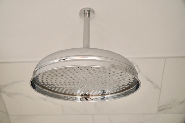 For the shower enclosure, we used a low-iron Shower-Guard glass with chrome hardware and a ladder pull handle. Shower-Guard glass is permanently protected from contaminants that corrode standard shower glass, dulling its appearance. When Shower-Guard glass is made, an invisible coating is fused to the surface, covering the microscopic peaks and valleys that naturally occur in float glass. This not only creates a smoother, shinier surface but also results in little opportunity for the residue to collect.