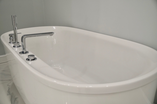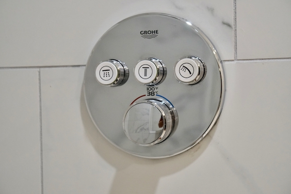 We used Grohe “Lineare” fixtures in this bathroom remodel. The shower is controlled by a SmartControl Triple Function Thermostatic Module in a Chrome finish. These fixtures keep with the concept of minimalism, this line is based on a composition of two simple geometric structures – cylindrical bodies and thin rectangular forms of the handle and spout create beautiful harmonious compositions.