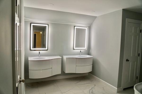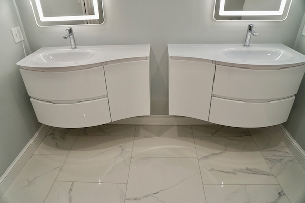 The left and right matching Baden Haus Vanities have tempered glass counters and sinks. These Italian vanities are sleek, modern, and super fun and add a visual element to any master bathroom remodel.
