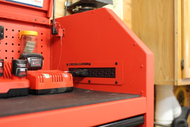 The lower cabinet has an external power strip mounted on the side panel and the upper chest has an internal power strip located inside the flip-up lid. We found this super convenient for charging cordless tool batteries.