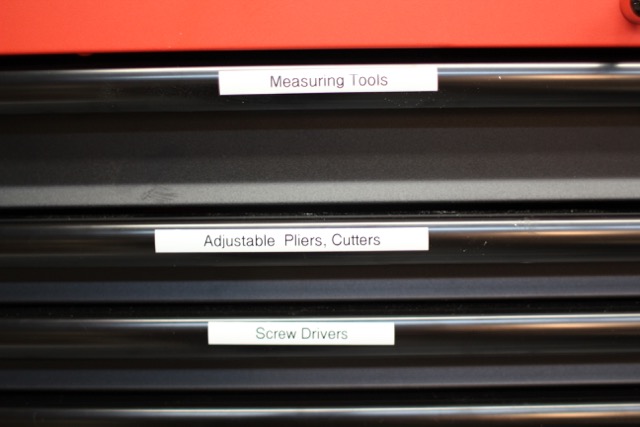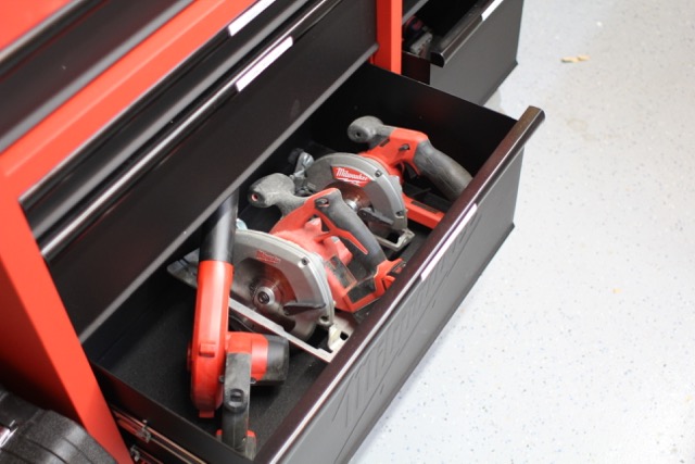 The tool cabinet, lower right drawer, has a removable power tool organizer to keep tools upright, and easily accessible. Cordless tools can be stowed so their handles are facing up, for quick access, or on their backs so you can see the working end of the tool for fast identification.