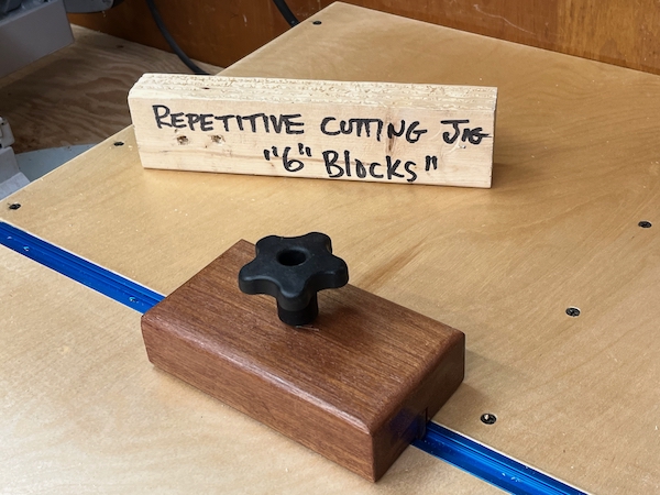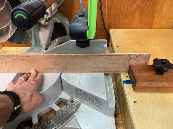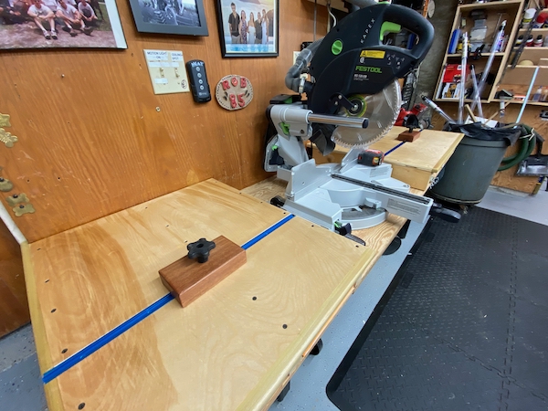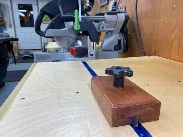 There are many systems and approaches available to purchase or to make your own, stop block. For my miter saw, I used a recessed Rockler t-track and a shop-made stop block.