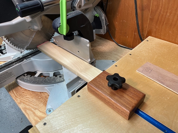 I had some leftover 1×4 and 2×4 mahogany, so I decided to make two 6-inch stop blocks out of the 2×4, and I used the 1×4 to make thin runners.