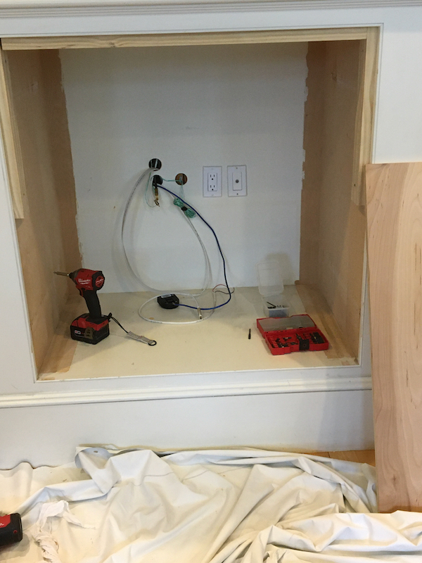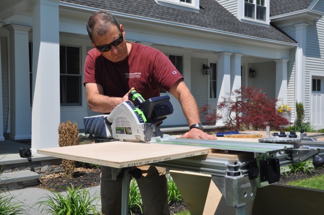 Then I cut the Birch plywood. Using a Festool track saw I back cut a 5-degree cut on the top and side of the panel to create a snug tight fit into the existing cabinet opening. The Birch plywood was then secured to the backer boards with 6-screws.