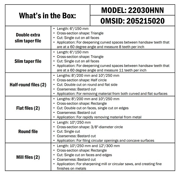 If you’re looking for a great set of files that will meet virtually all of your needs on a jobsite, and comes at a reasonable price, the Nicholson 9 Piece Hand File Set with Ergonomic Handles, American Pattern (part number 22030HNN) is your huckleberry.