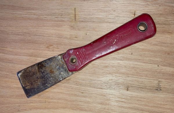 The one I carry is an old 1½-inch, medium-flexing, cheap putty knife.  You can see from the photo that it’s seen a lot of use, although not better days.  It’s always getting used for applying spackle, scraping, cleaning out cracks and corners, prying trim, and a million other tasks.  You can slip it between two items and twist it to lever the pieces apart.  Wrap a rag around the blade and clean up excess paint.  A million uses!
