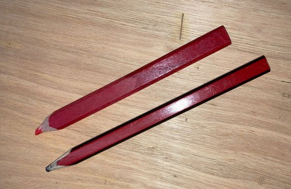 Most of the time we layout and mark wood with a regular black pencil.  But sometimes we’re laying out two separate things over the same distance.  Sometimes we make a mistake (“Whoops —  I forgot about the 1½-inch offset.”) and have to re-layout.  We could erase or sand off the original marks, or just put a squiggly line thru them, but often it’s easier, or more appropriate, or more fool-proof, to do the corrected layout in a different color (especially if someone one other than us will be relying on those layout marks).  That’s why I have a red carpenter’s pencil in my bag along with several black ones.