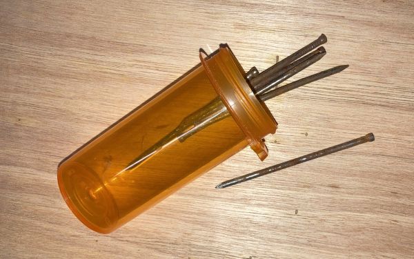 Anytime we work in a finished space we’re always trying to locate the studs behind the drywall.  Stud finders are a big help, but don’t always work well, and tapping the wall is even less precise.  Even when I’m pretty sure where a stud is I always verify that there’s “meat” where I want to drive a fastener by pounding a 16d finish nail where I think the center of that stud is.   On a bad day, stud finders and tapping aren’t any help at all and I’m reduced to driving a 16d nail along a horizontal line every inch or so until I hit one.  But whether verifying or searching for a stud, a 16d finish nail is essential.  I keep a few of them in an old pill bottle in my bag.  (You can see in the photo that the nails had gotten rusty while they were stored in a coffee can because I don’t have much other use for them in this age of finish screws.)