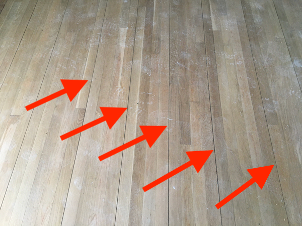I recently looked at a house for sale with Oak floors. The second I walked into the house I noticed multiple open seams in the hardwood flooring. The weird part was that these seams were evenly spaced approximately every 7 to 8 inches. The reason for these consistent and uniform seams is MOST likely caused by installing the hardwood floor in the same direction as the plank subfloor. When the old plank boards expand and contract, they take the hardwood boards with then – resulting in seams.