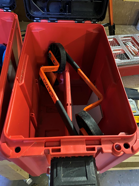 Milwaukee recently sent us the new 2 wheel cart to review. I have had this cart on a few sites. It works exceptionally well going up and down the stairs. The large 10″ wheels roll super smoothly. This cart is a great option if you are not using your wheeled tool box.