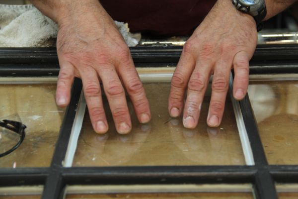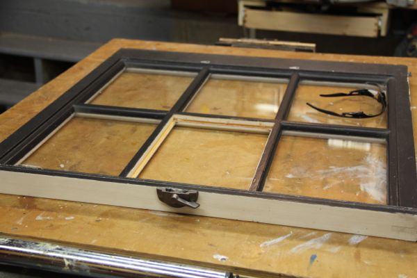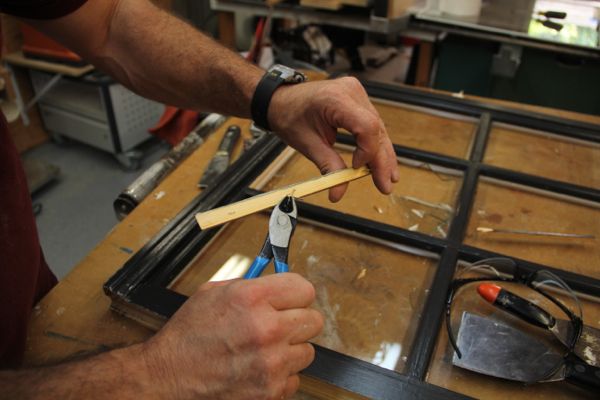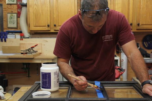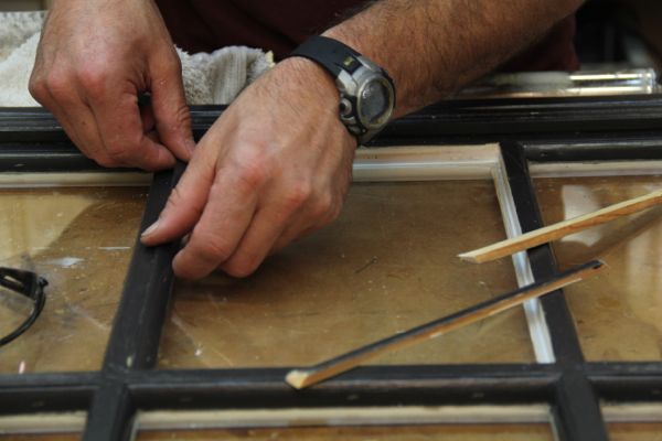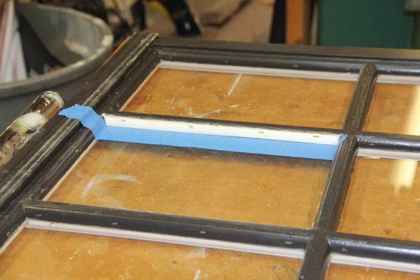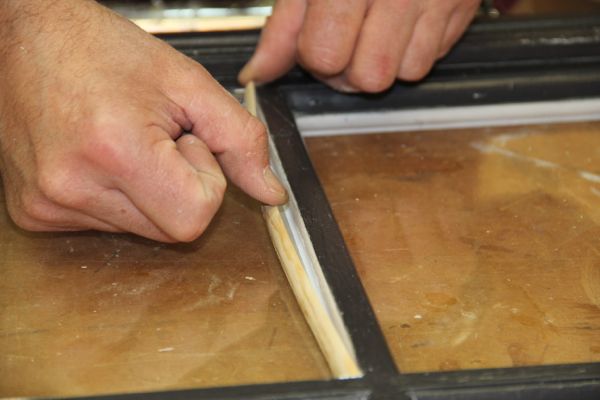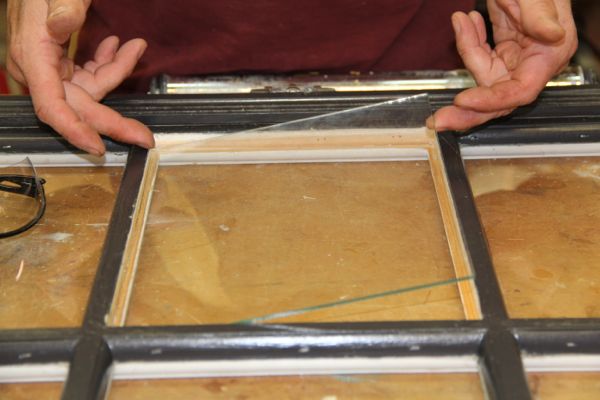 Note – on putty windows you would create a bed of putty to set or “bed” the glass into the window frame, insert the glass, then apply a slanted bed of putty with your putty or glazing knife. [This process is not shown here]