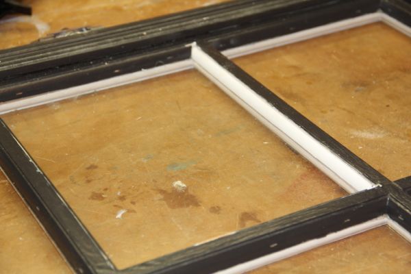 I used a thin layer of caulking to set or “bed” the new glass pane in place and then reinstalled the wood stops.