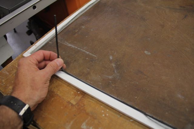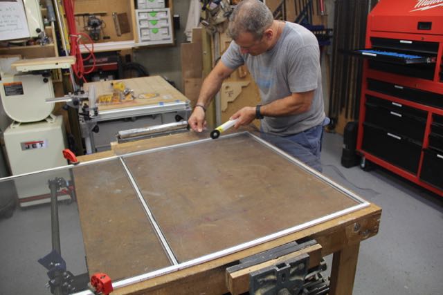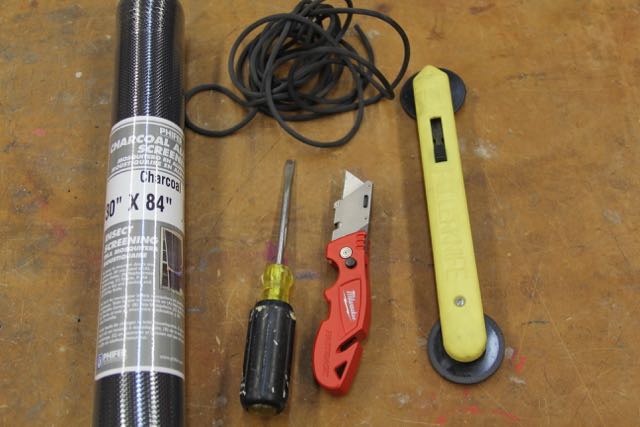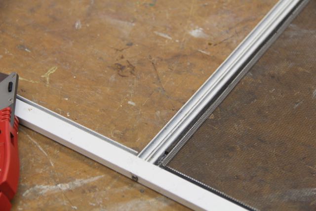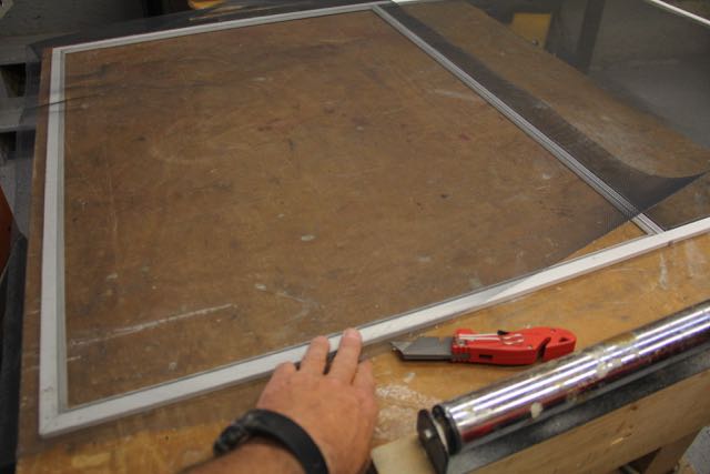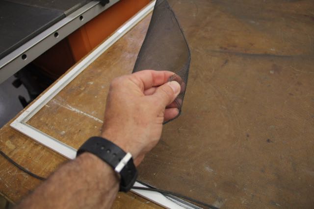 Tip: when installing fiberglass screening ensure that you keep the screen taunt and wrinkle free. Ive accomplished this by using clamps, a helper or adding weight to hold the excess screening hanging off the far end – tight! don’t install the fiberglass too tight or you can warp the screen.