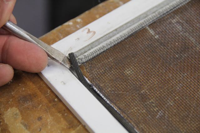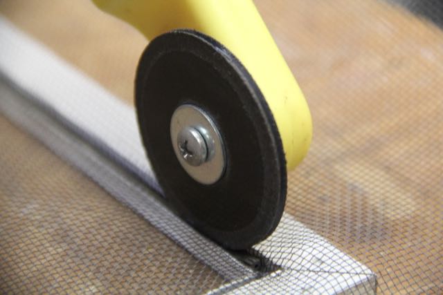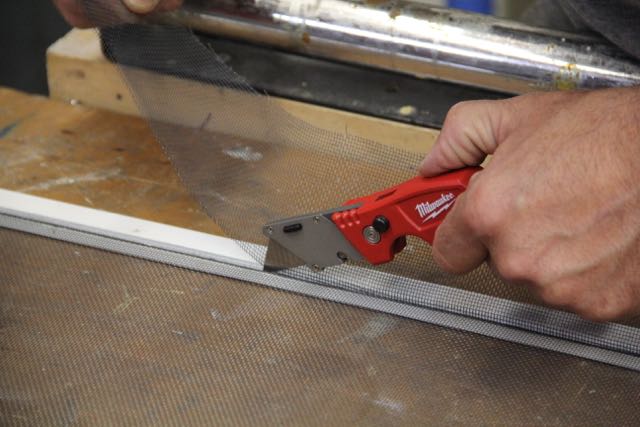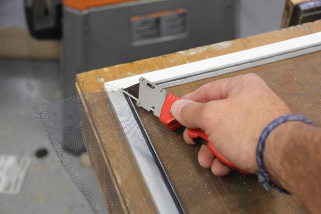 Using a sharp utility knife, trim the excess screen by cutting alone the spline. Hold the screen taut as you cut with the knife.