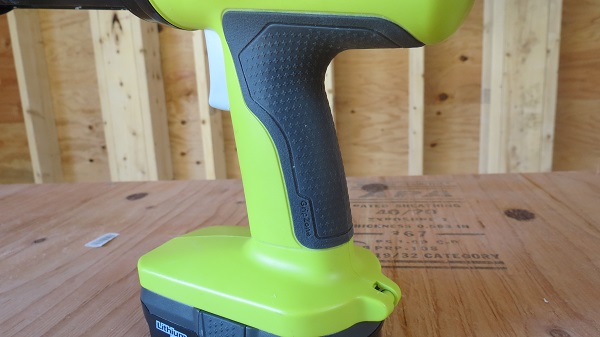 Their Lime green color for the 18v One+ system makes it stand out. The Power Caulk Gun is balanced with no caulk cartridge in. The metal carriage holder feels solid. The grip is comfortable and textured to reduce slippage. Has a variable speed selector with 5 plus settings.