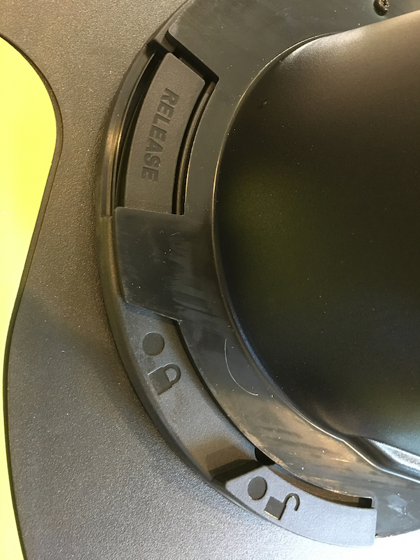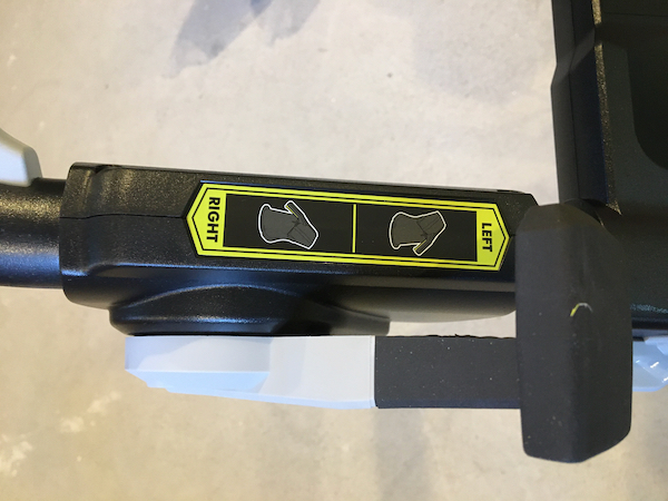 The battery compartment has a semi-transparent plastic cover to protect the 2 batteries from the snow. The chute deflector’s angle is adjusted manually with the attached gray handle. In the front of the blower is a long LED headlight bar that turns on the second you squeeze one of the impeller controls. The LED headlights are quite bright and they are always on during operation–they turn off automatically after 1-minute of inactivity.