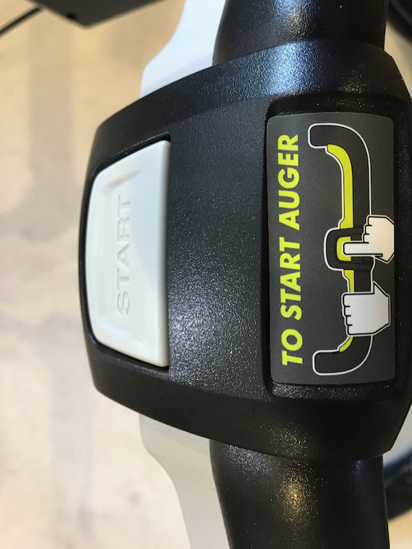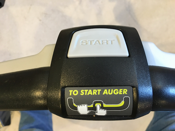 The Ryobi snow blower’s impeller started each and every time with a simple squeeze of the impeller control levers and a push of the button. This was something that I was not accustomed to after years of wrestling with a gas-powered snowblower. It was so nice not having to prime the engine with gas and struggle with a pull-cord or an electric start. After stopping the unit, the placement of the large start button allowed me to re-start it without even looking down at the handle. Anyone who has ever struggled to start a gas blower will love the simplicity of the Ryobi Snow Blower.