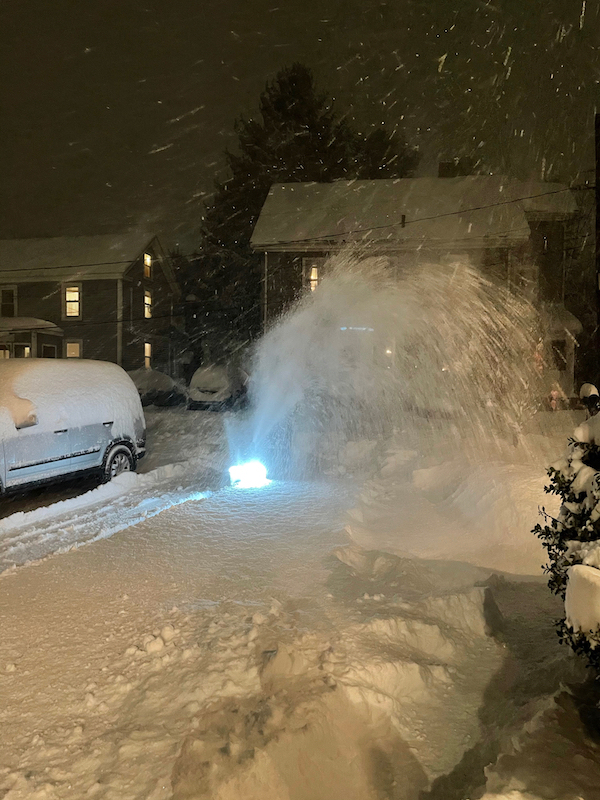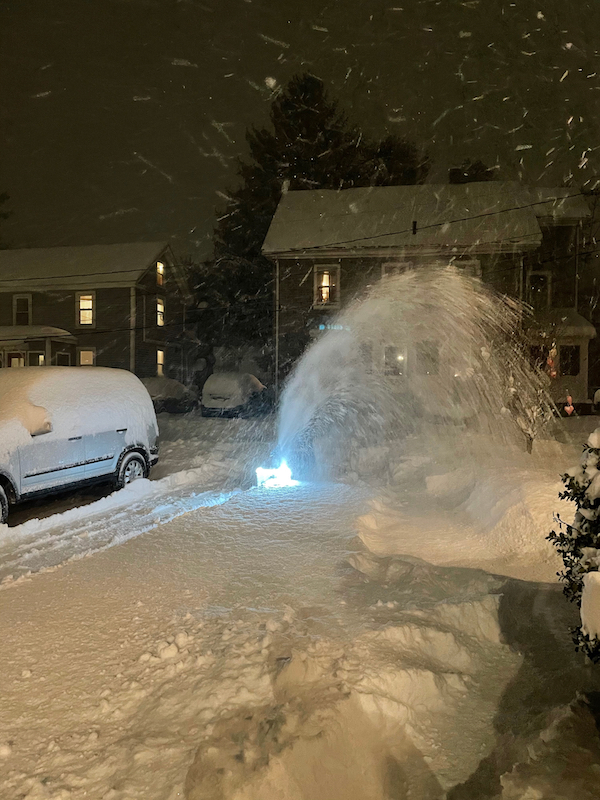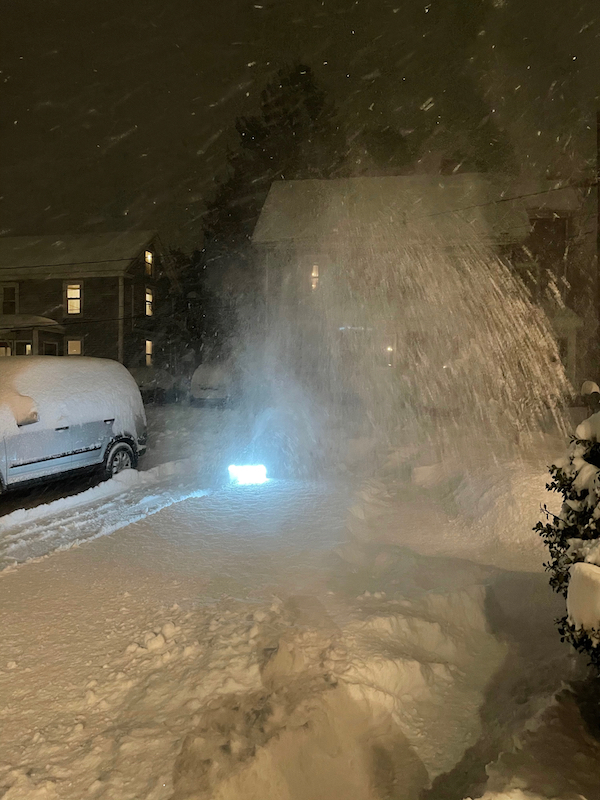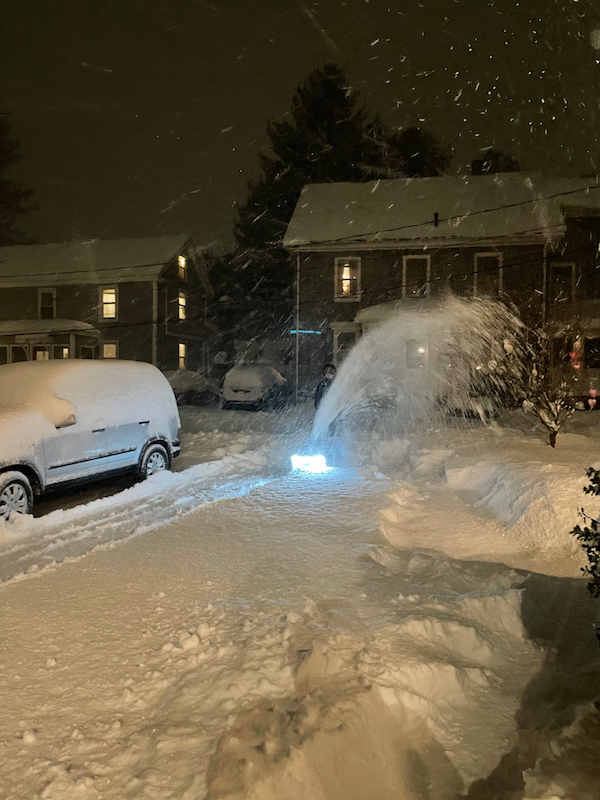 On December 17, 2020, the suburbs of Boston received 13-14 inches of very light snow. I began by creating a 75-foot long path to my driveway from my basement’s bulkhead. The Ryobi had a little trouble traveling across the uneven ground piled high with 14 inches of snow. Once I made it to the driveway, the snowblower worked much better on the flat asphalt.