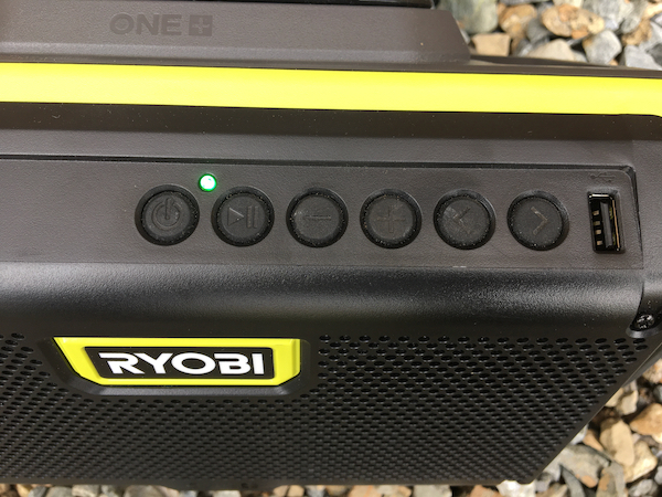 The Ryobi 18V One+ Speaker works exclusively over Bluetooth. There is no auxiliary input jack available to connect a device, which is too bad since that would have been an added convenience. The PAD01B has 6 clearly labeled on-board control buttons on the top of the speaker—power, play/pause, volume up, volume down, next track, and previous track. When you turn on the speaker, it will give an audible “power on” announcement and the green LED illuminates. There is also an audible “power off” announcement when you turn it off.