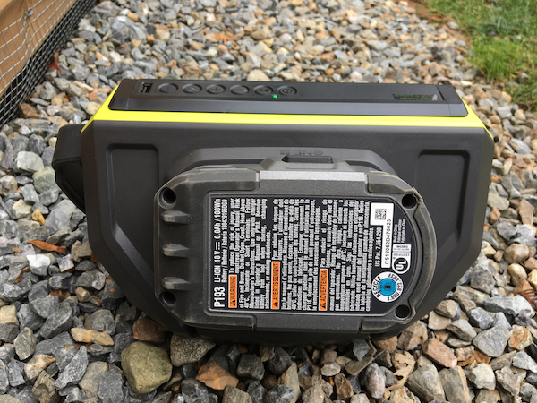 The speaker is angled in the front so that the music is directed up and away from the speaker. I think this angled design contributes to its ability to fill a space with booming sound. Importantly, a battery and charger are not included with the Ryobi PAD01B, so be prepared to provide your own.