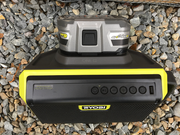 The speaker is angled in the front so that the music is directed up and away from the speaker. I think this angled design contributes to its ability to fill a space with booming sound. Importantly, a battery and charger are not included with the Ryobi PAD01B, so be prepared to provide your own.