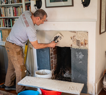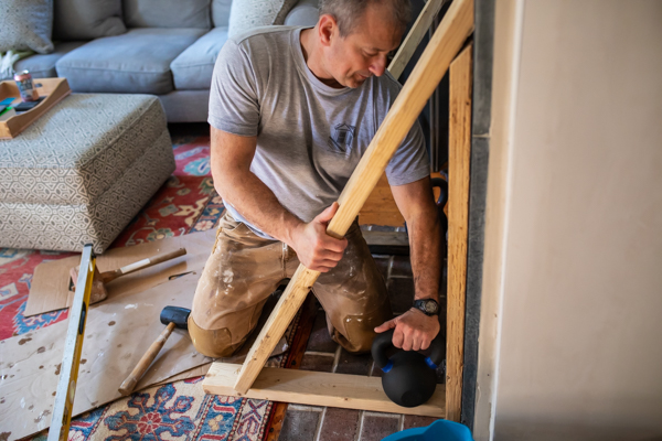 In order to install a soapstone fireplace surround you first need to remove the old fireplace mantle, if there is one installed. The mantle can be removed by using the small pry bar. In our situation, we needed to repair the plaster wall above and on both sides of the fireplace