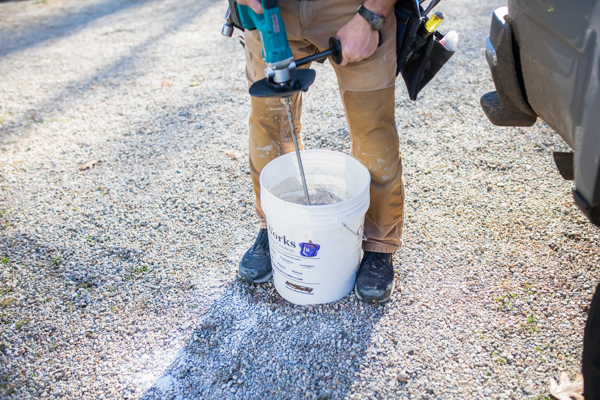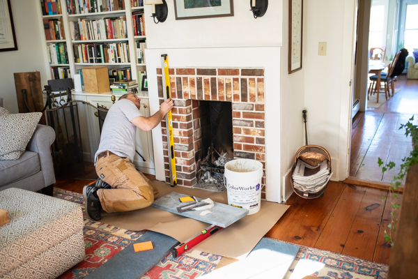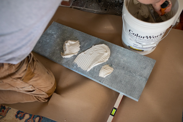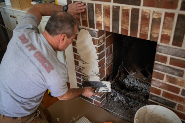 Mix up a half bag of white thin-set, create a thick paste-like mix that can be troweled on the vertical wall. Make sure you install builders’ paper on the floor in front of the fireplace. Using a ¼” trowel, apply the thin-set to the brick façade and then to each piece of the bluestone